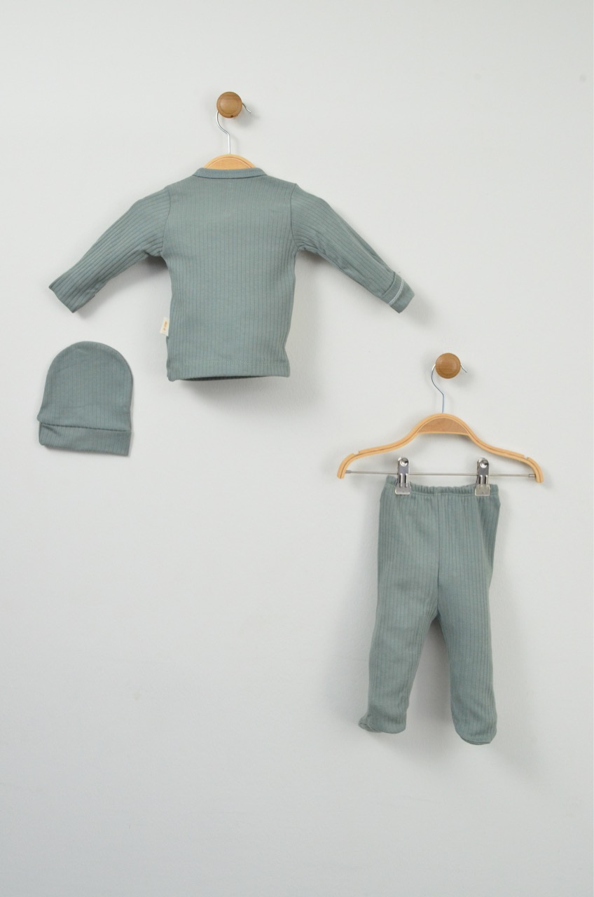 Bu sevimli mint yeşili %100 pamuk yenidoğan üçlü takım, bebeğinizin ilk günlerinde ihtiyaç duyacağı konforu ve şirinliği bir arada sunar. Tamamen pamuk içeriği sayesinde bebeğinizin cildine nazikçe dokunur.
