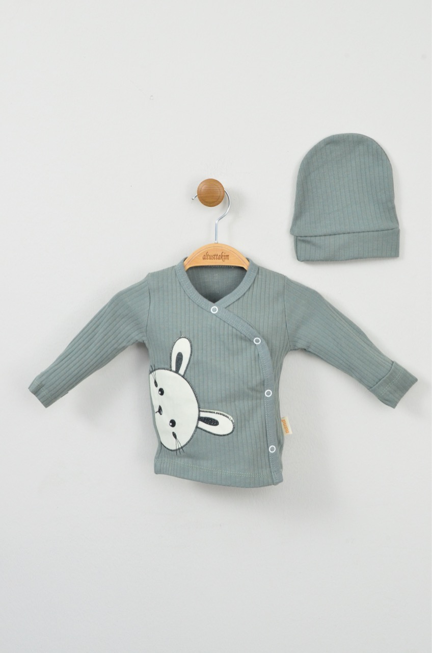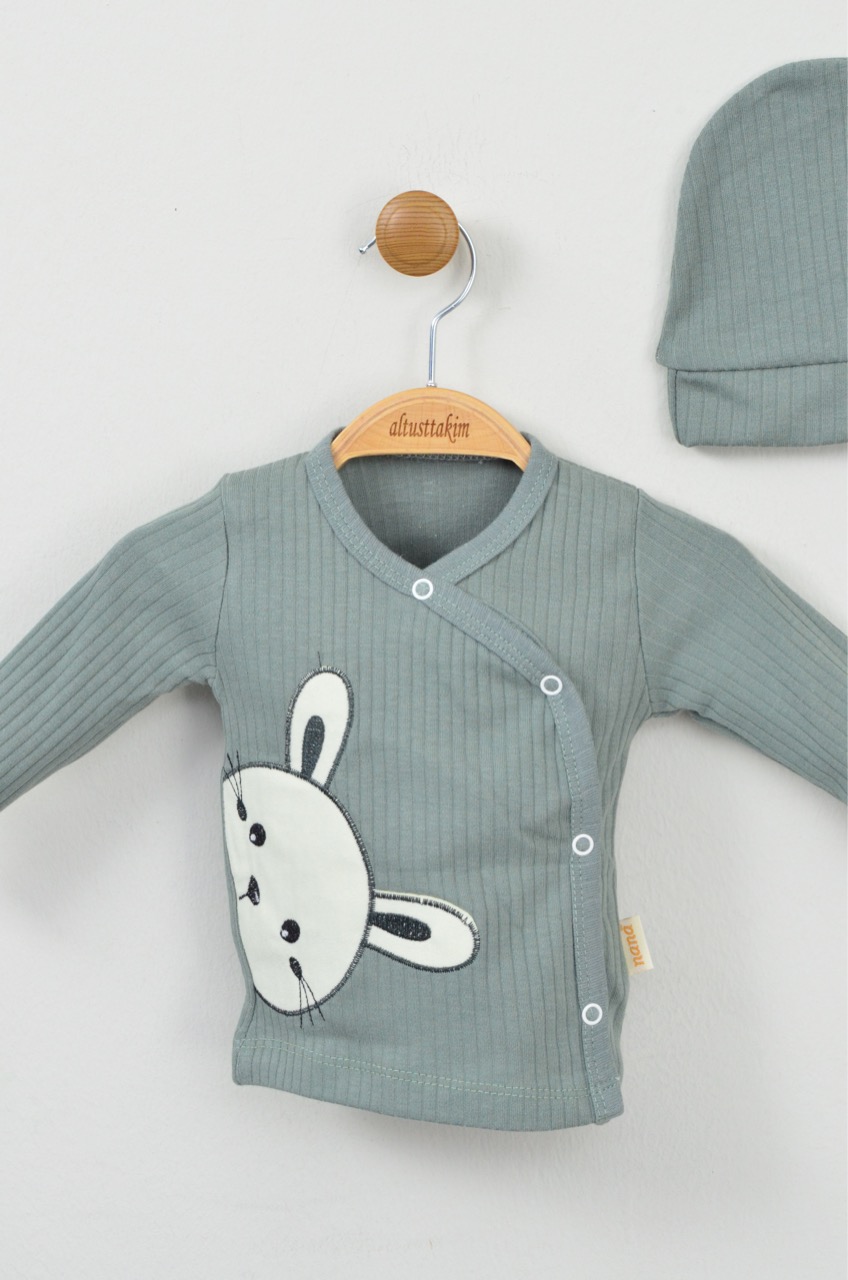 Mint Yeşili Tavşan Aplike %100 Pamuk Yenidoğan Üçlü Takım(0-3 Ay)