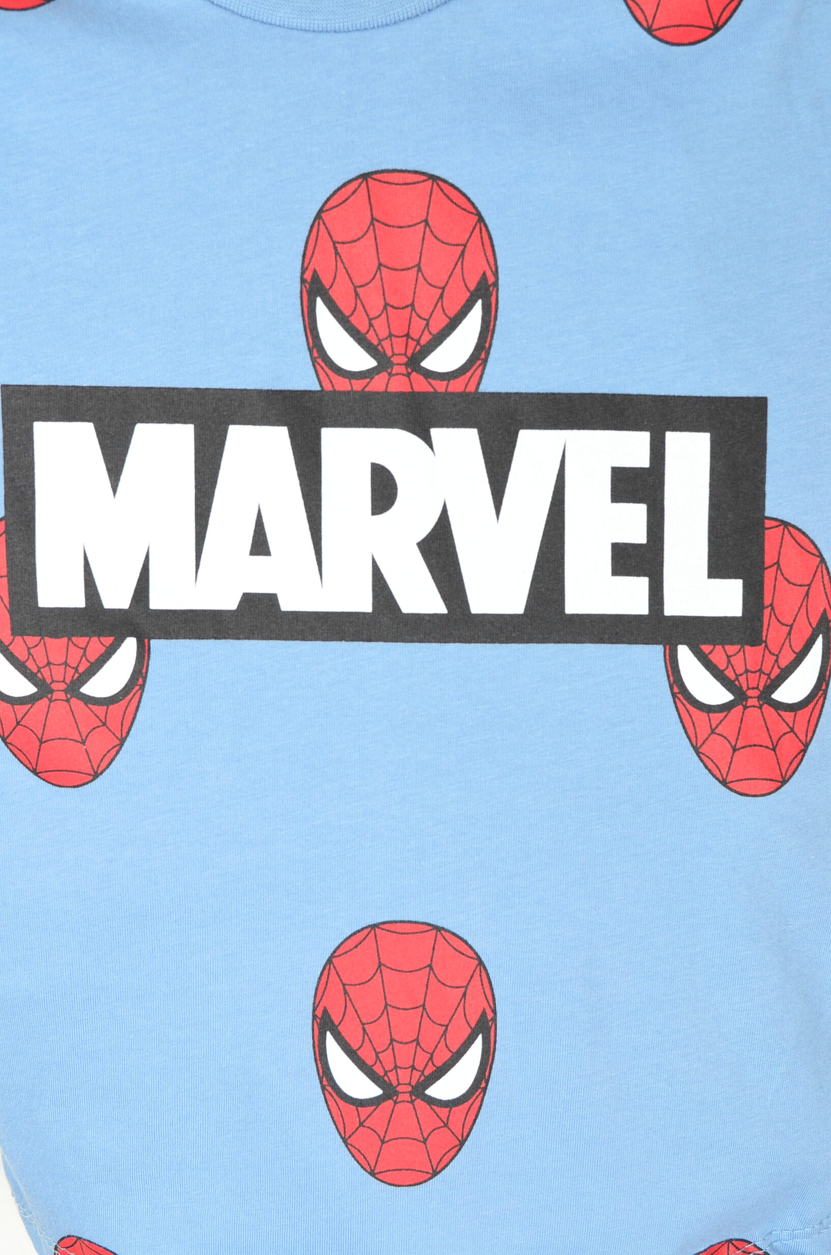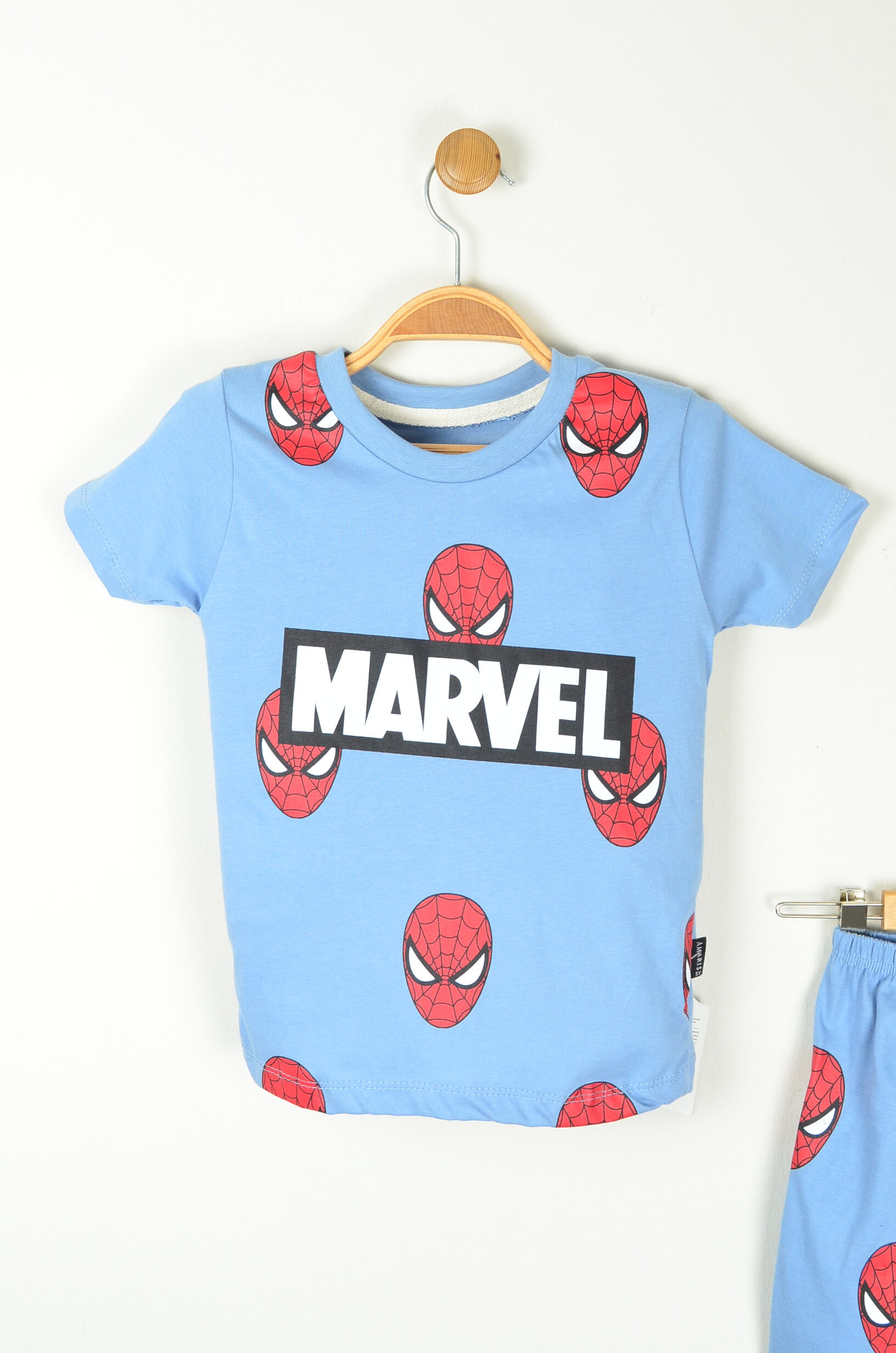• Üst: Kısa kollu, bisiklet yaka, açık mavi renkli, her tarafı Örümcek Adam maskesi desenli ve ön kısmında “MARVEL” yazısı bulunur.