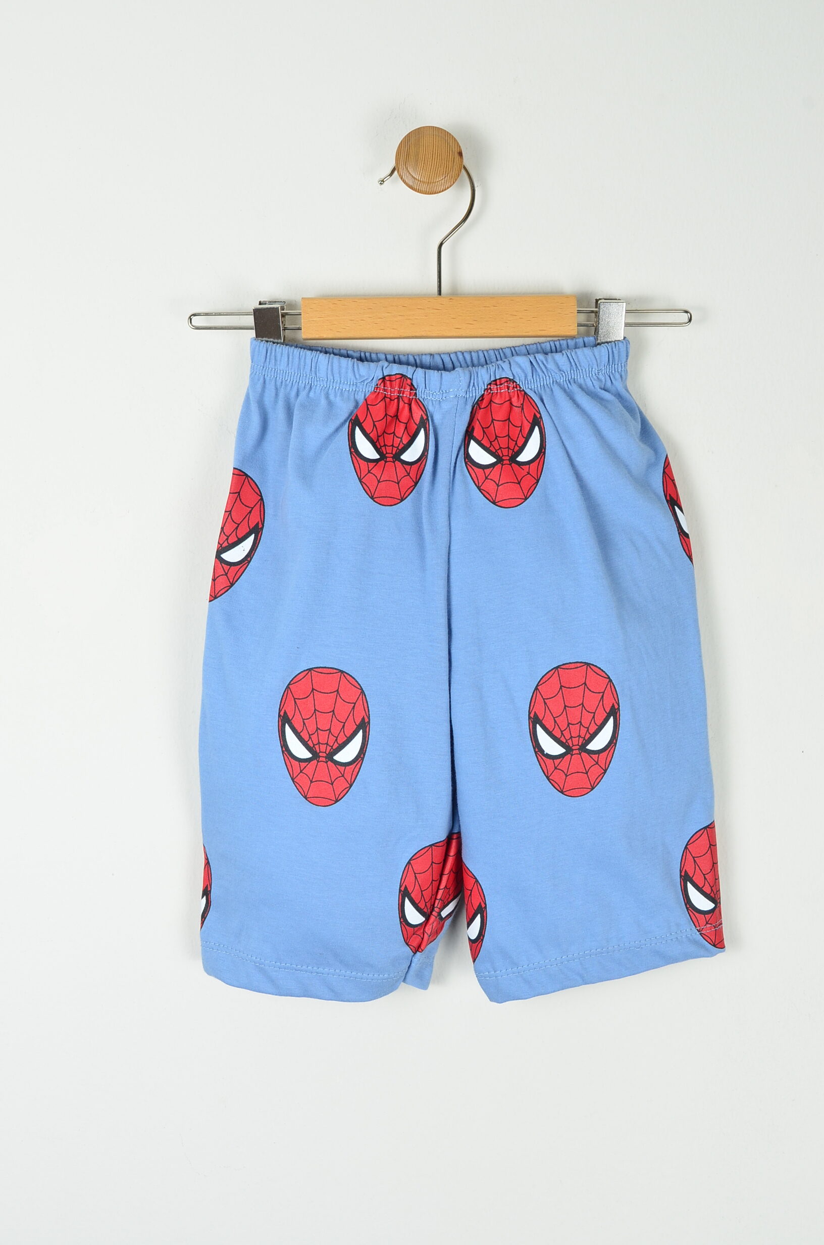 • Alt: Beli lastikli, açık mavi renkli, her tarafı Örümcek Adam maskesi desenli rahat kesim şort.