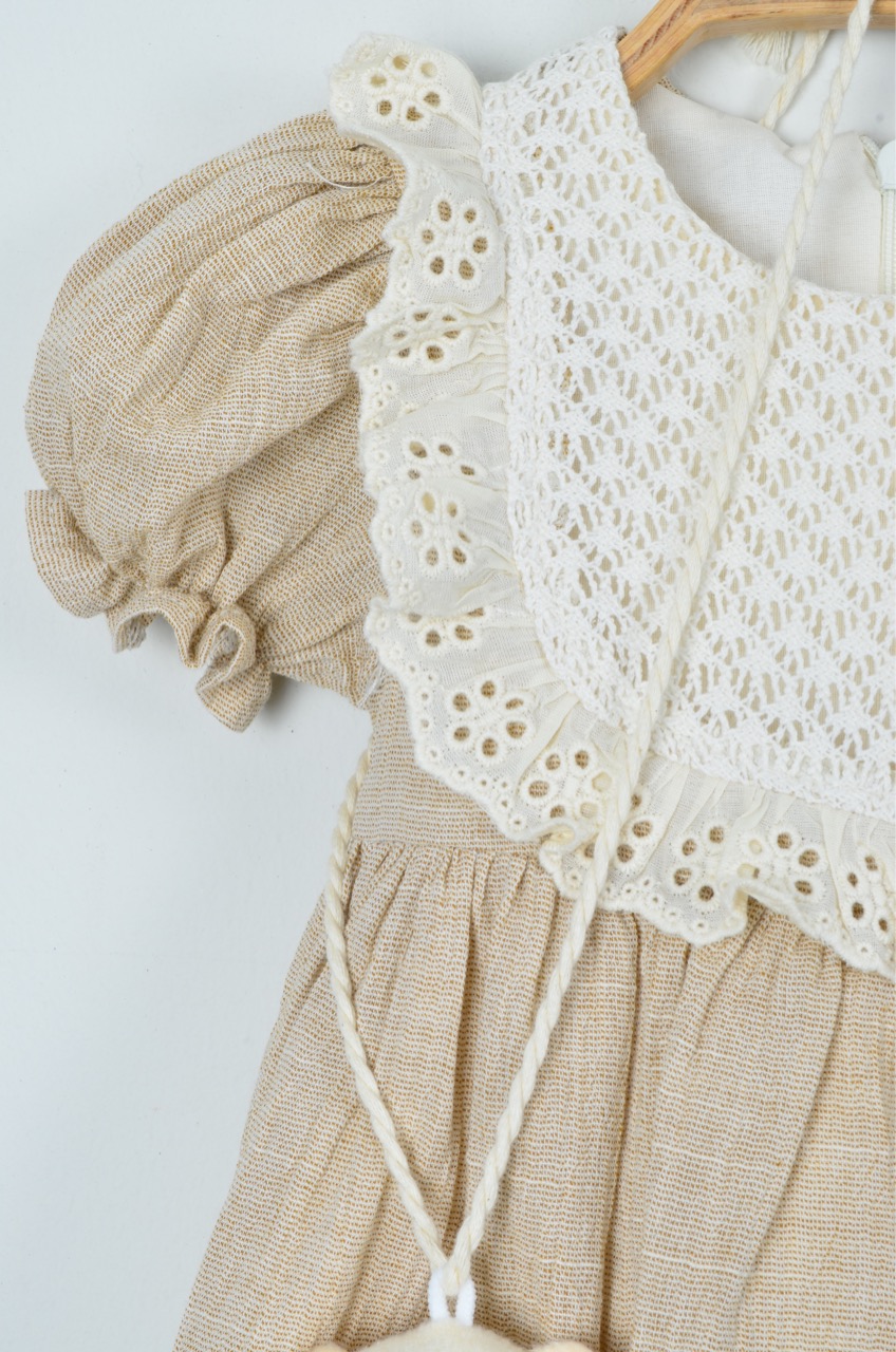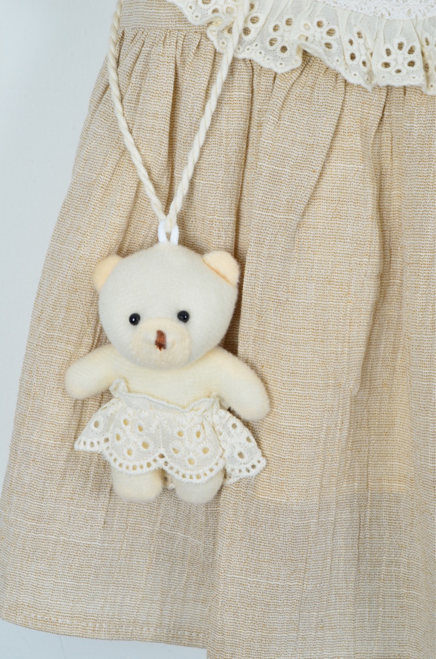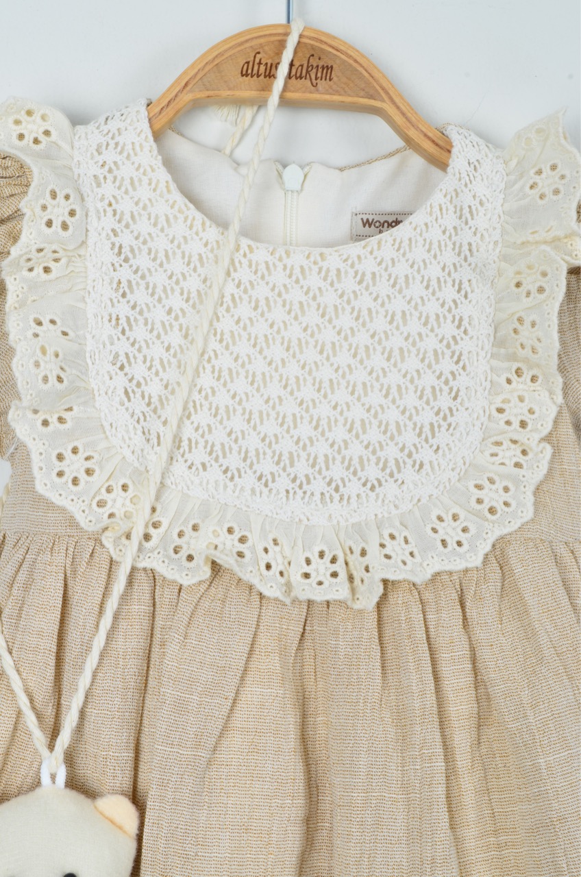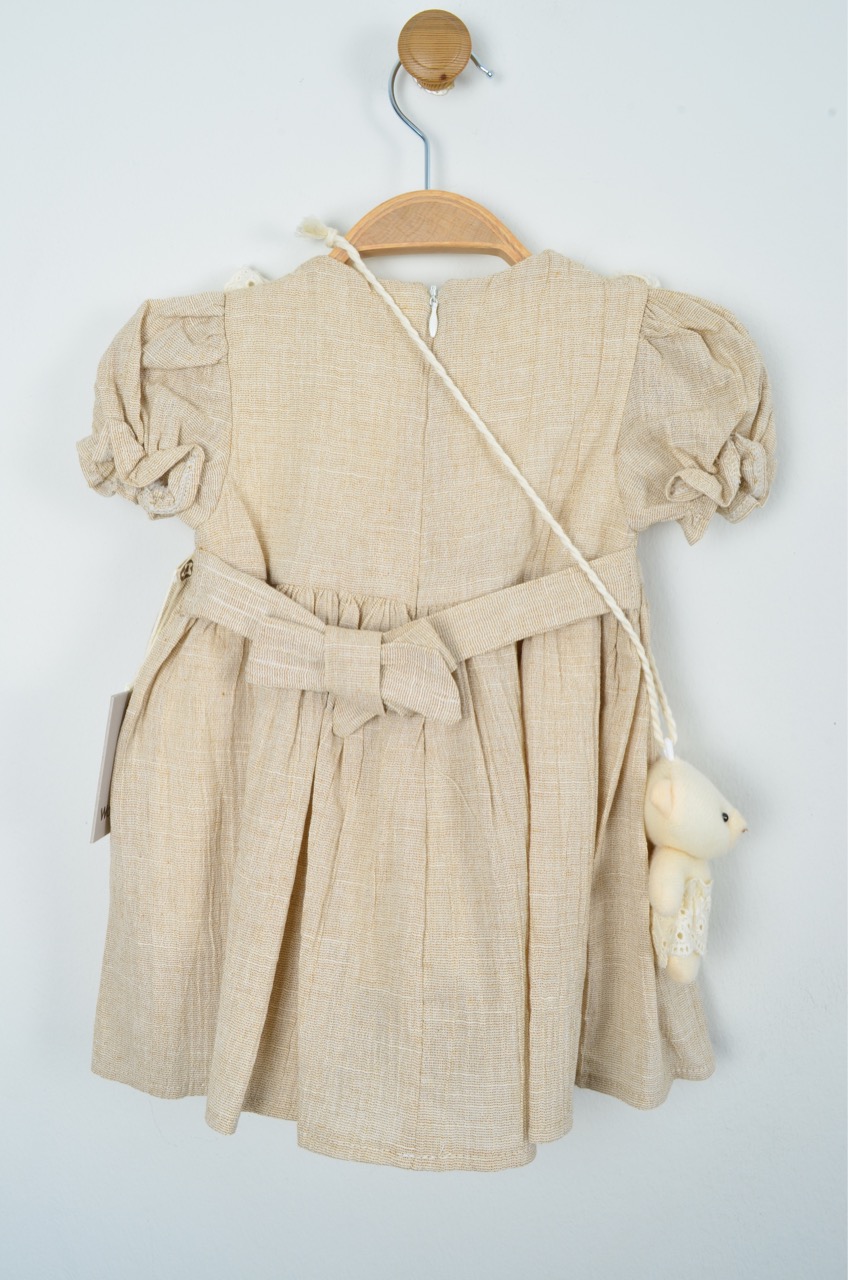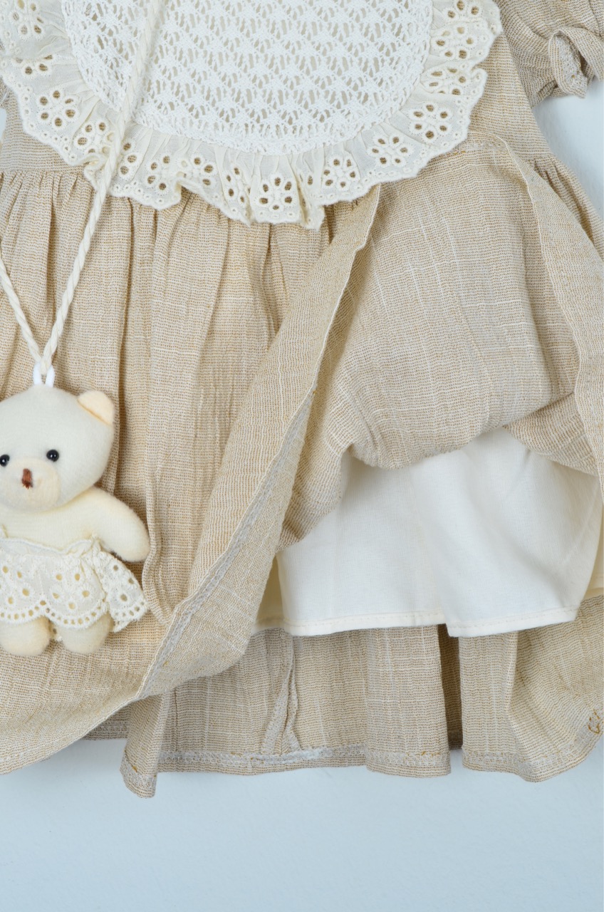 Dantel Yakalı ve Ayıcık Aksesuarlı %100 Pamuk Astarlı Keten Dokulu Bebek Elbisesi