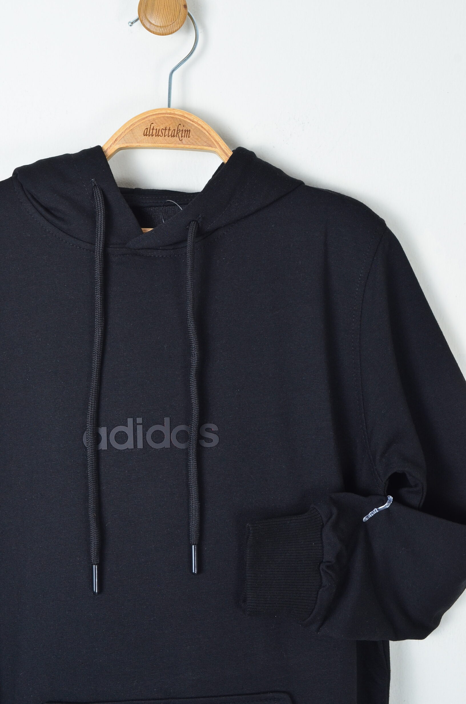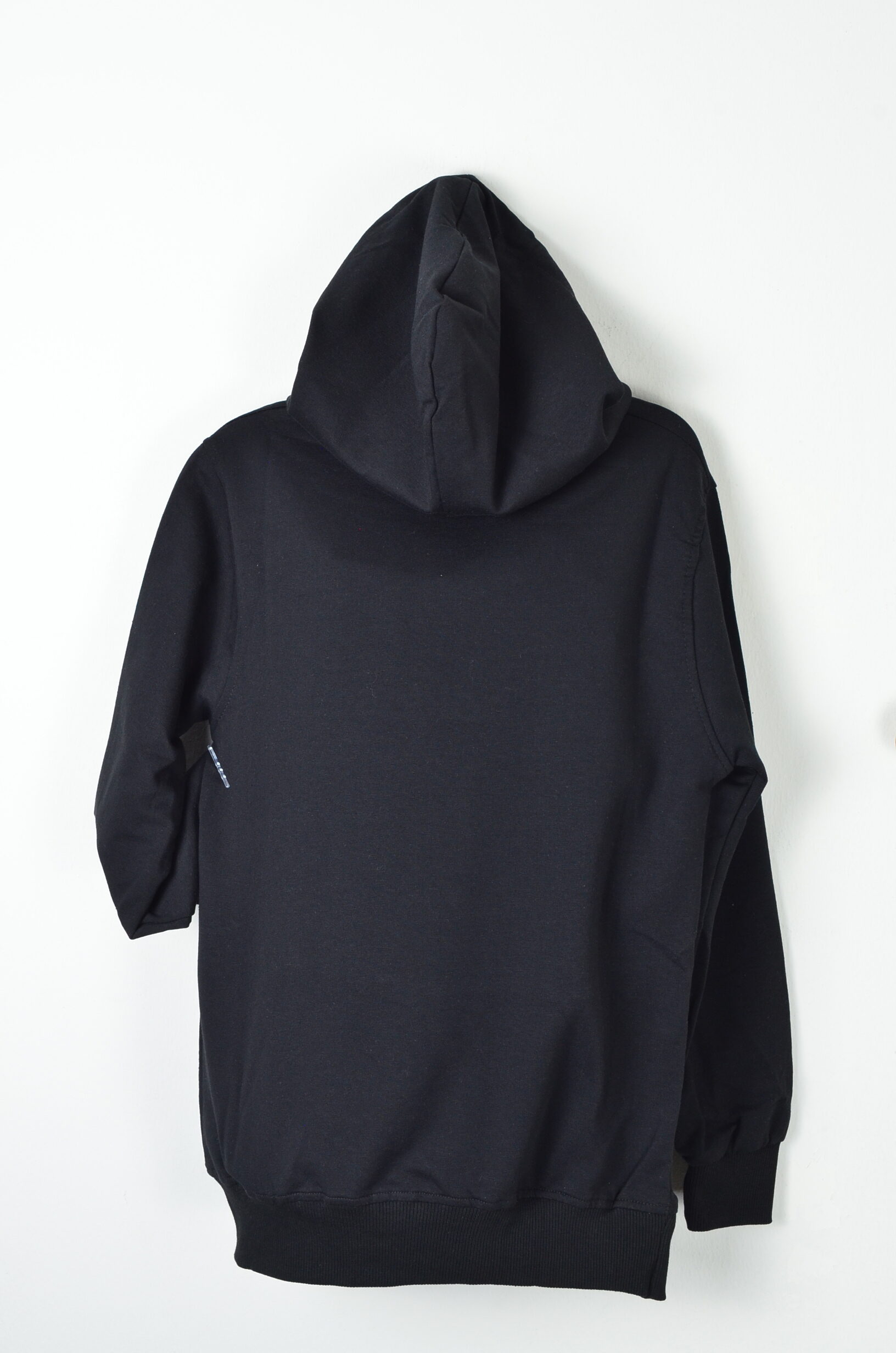 • Sweatshirt: Kapüşonlu, uzun kollu, önde kanguru cepli, siyah renkli.