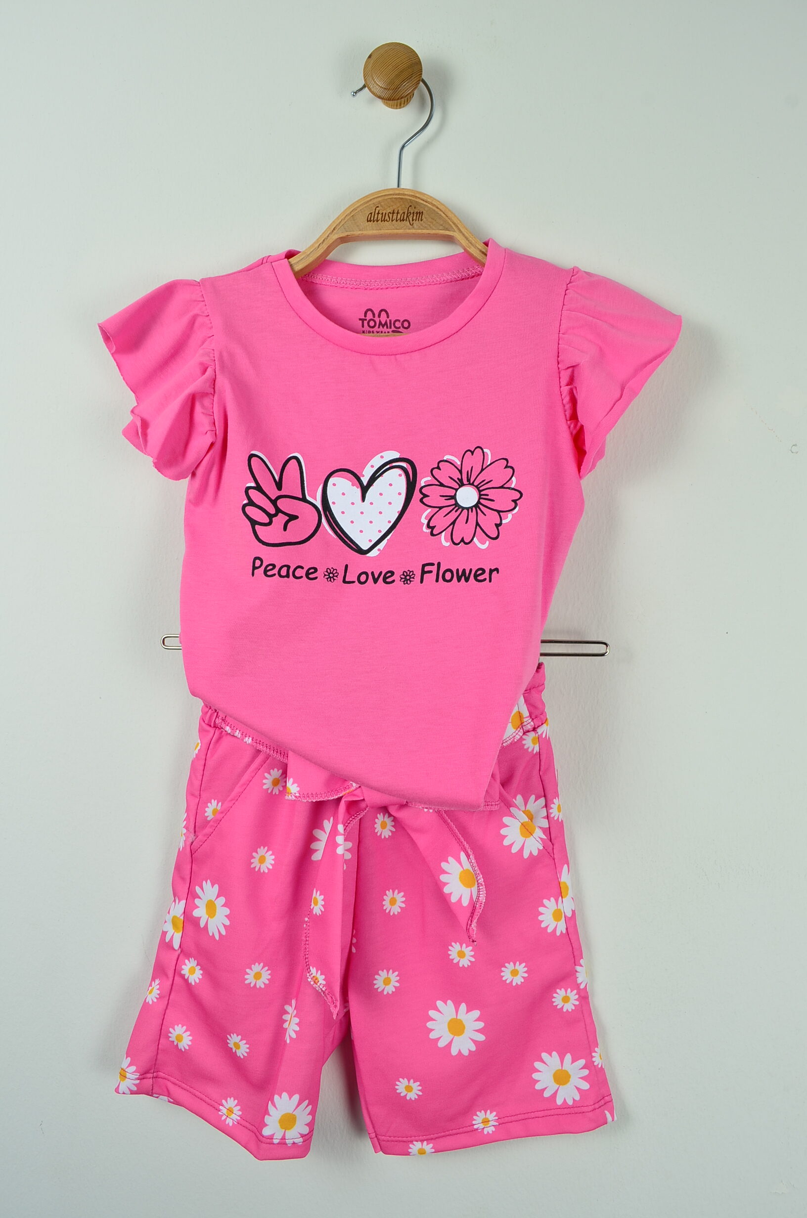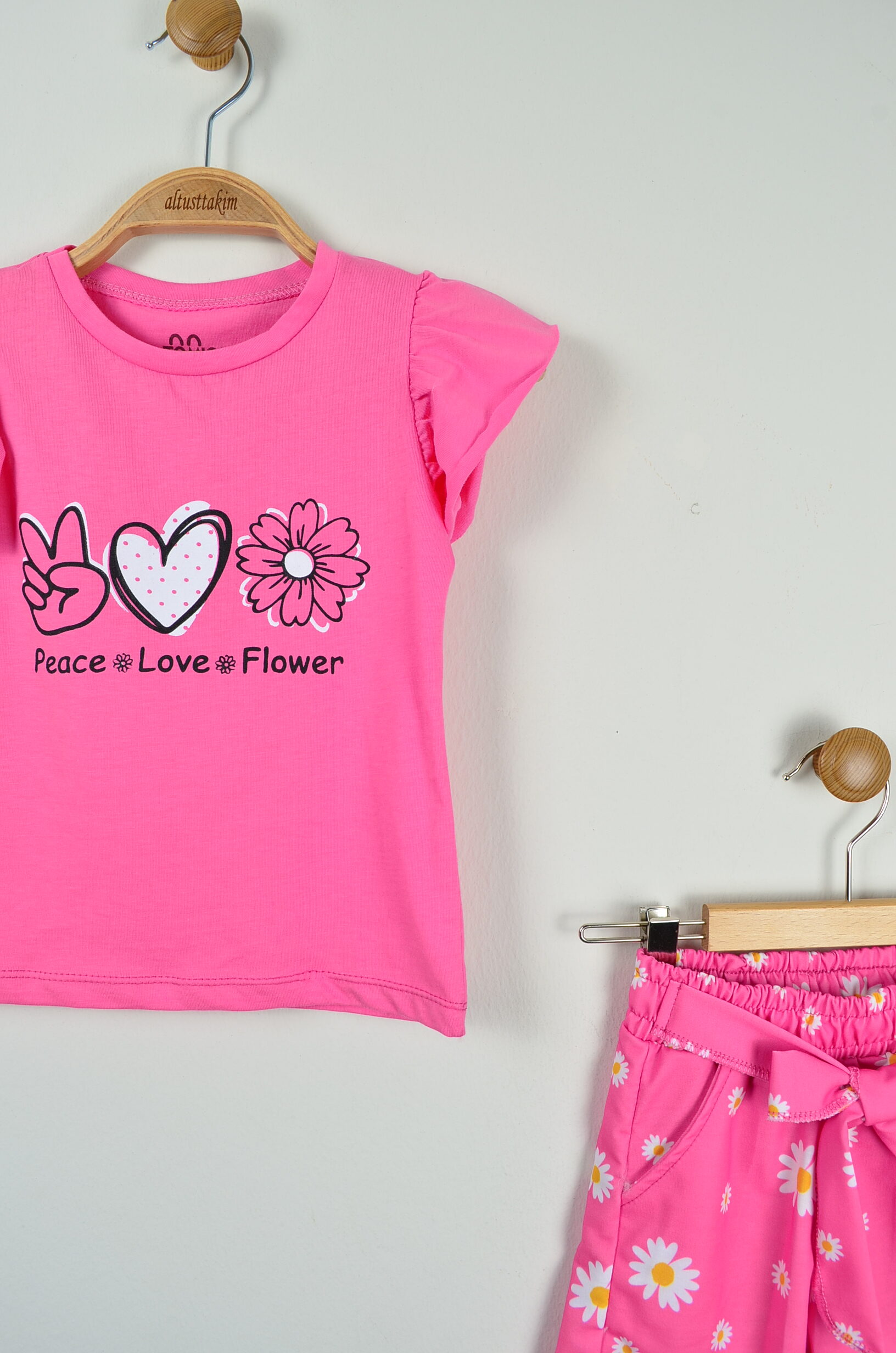Bu iki parçalı takım, kız çocuklarınızın yaz aylarında hem rahat etmesi hem de baharın neşeli enerjisini taşıması için tasarlandı. Canlı pembe tişörtün üzerindeki “Peace & Love & Flower” yazısı, sevimli kalp ve papatya motifleri, uyumlu pembe şortun üzerindeki beyaz papatya desenleriyle birleşerek dinamik ve cıvıl cıvıl bir görünüm sunar. İnce kumaş içeriği sayesinde hassas çocuk cildine dosttur ve nefes alabilen yapısıyla sıcak havalarda ideal bir tercihtir.