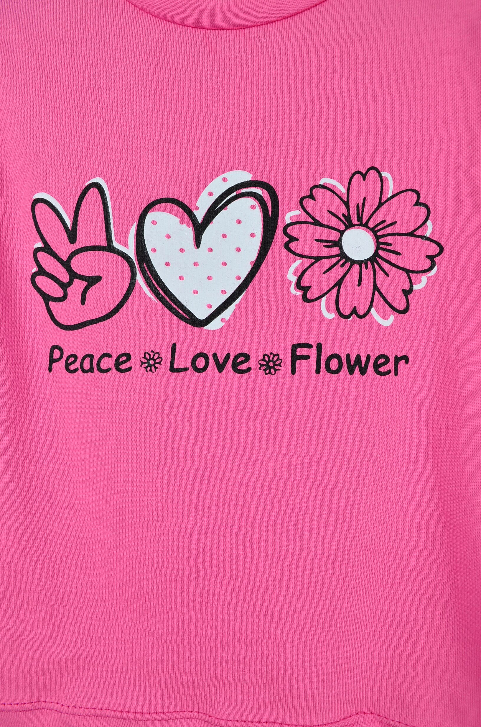 - Tişört: Kısa kollu, bisiklet yaka, pembe renkli, ön kısmında “Peace & Love & Flower” yazısı ile papatya ve kalp baskısı bulunur.