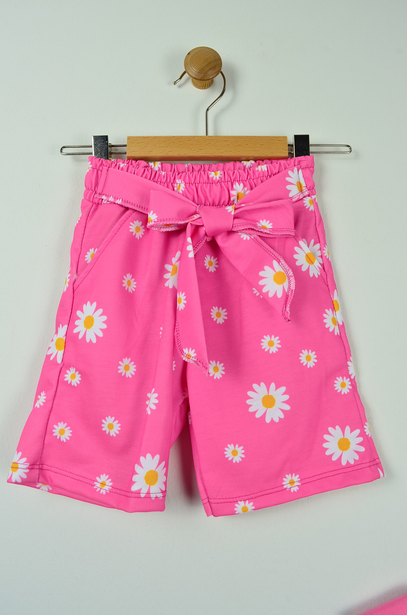 - Şort: Belden lastikli ve büzgülü, rahat kesim, pembe renkli, üzerinde beyaz papatya desenleri baskısı bulunur. Bel kısmında kemer detayı mevcuttur.