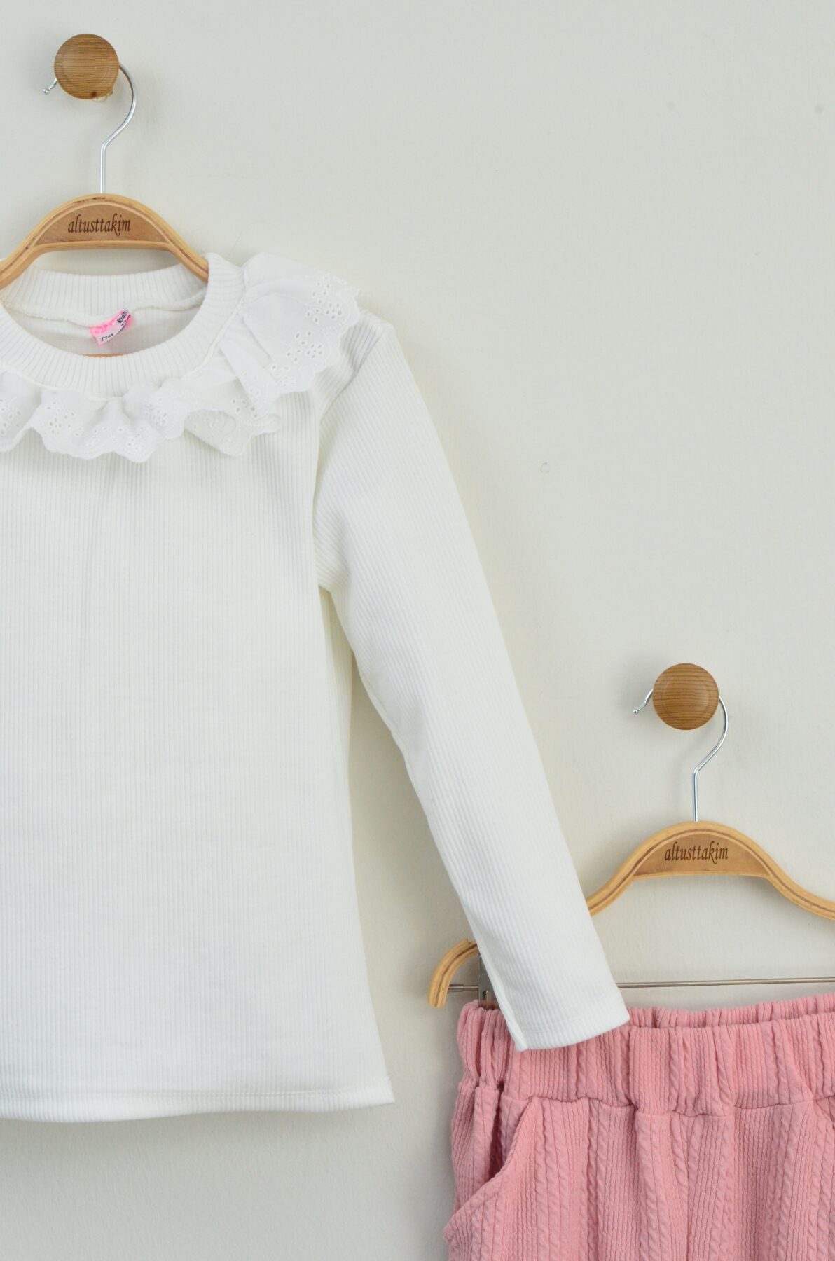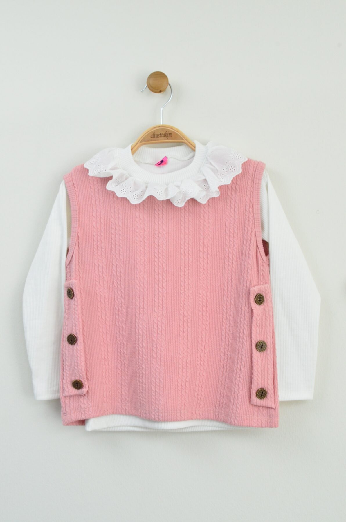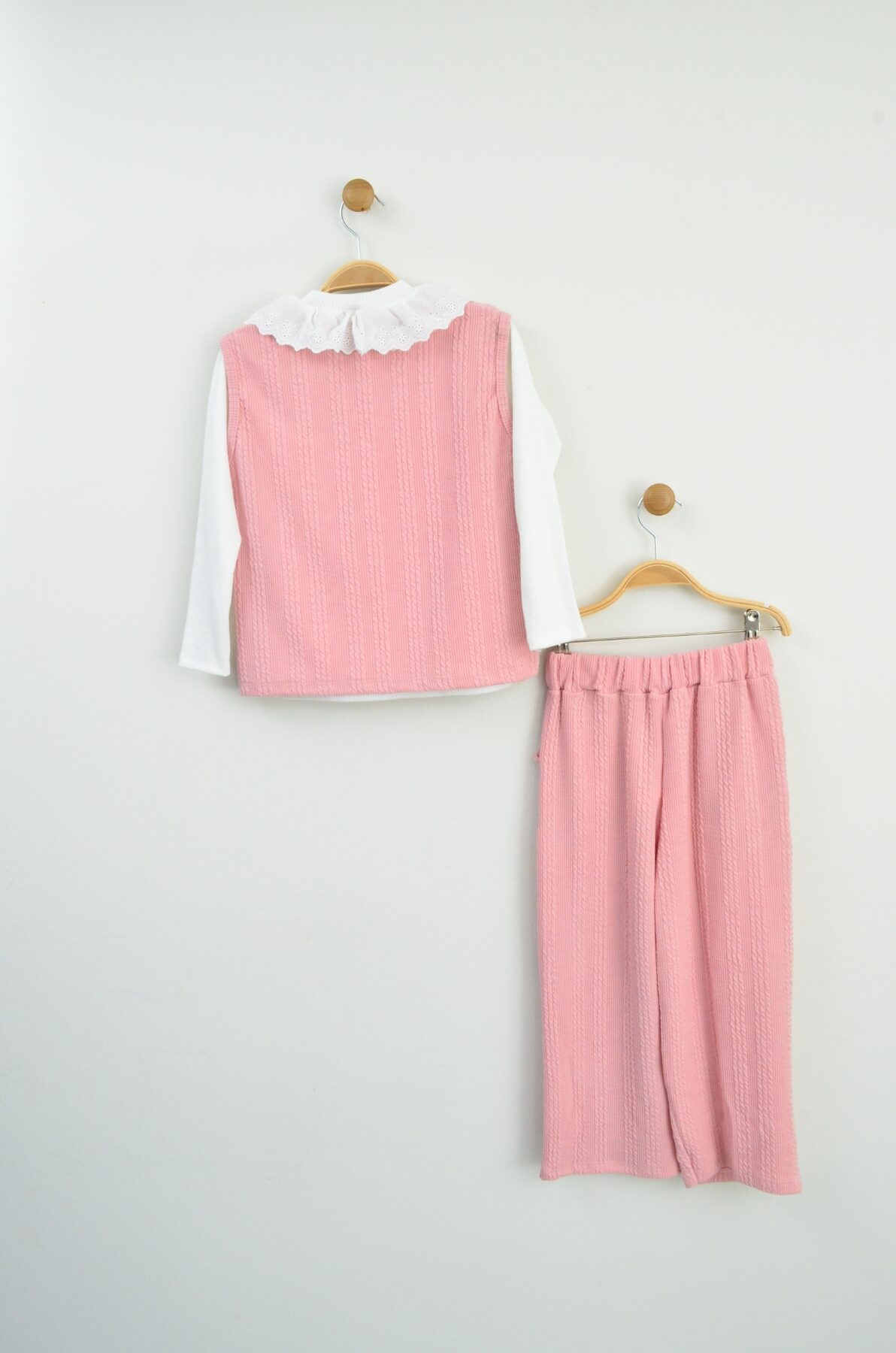 Miniklerin günlük hayatında hem şık hem de rahat olmasını sağlayacak bu iki parça takım, pembe rengi ve fırfırlı yeleğiyle dikkat çekiyor. Yumuşacık fitilli kumaşı sayesinde çocuğunuz gün boyu konforlu hissederken, özgün tasarımıyla da göz kamaştıracak.