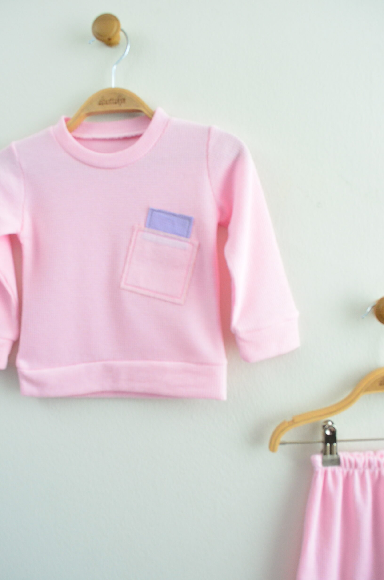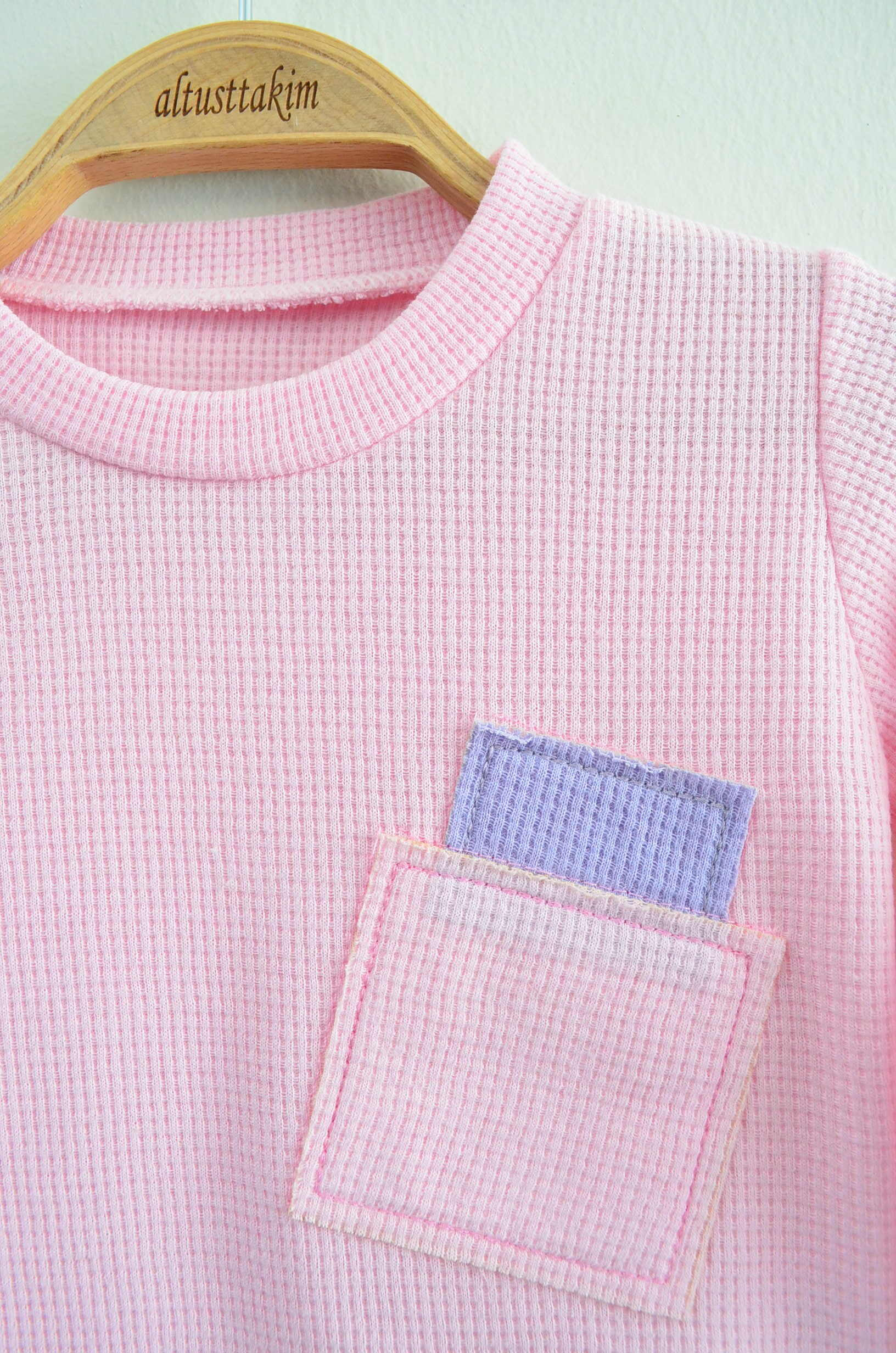 Bu iki parçalı takım, 6-24 aylık kız bebeklerinizin serin havalarda veya ev içinde rahatlıkla giyebileceği şekilde tasarlandı. Pembe renkli, kareli dokulu, uzun kollu sweatshirt üzerindeki mor renkli cepli detayı, uyumlu pembe rahat kesim eşofman altı ve diz kısımlarındaki mor yama detaylarıyla birleşerek sevimli ve modern bir görünüm sunar. %100 pamuk ince kumaş içeriği sayesinde hassas bebek cildine dosttur ve nefes alabilen yapısıyla konforlu bir kullanım sağlar.