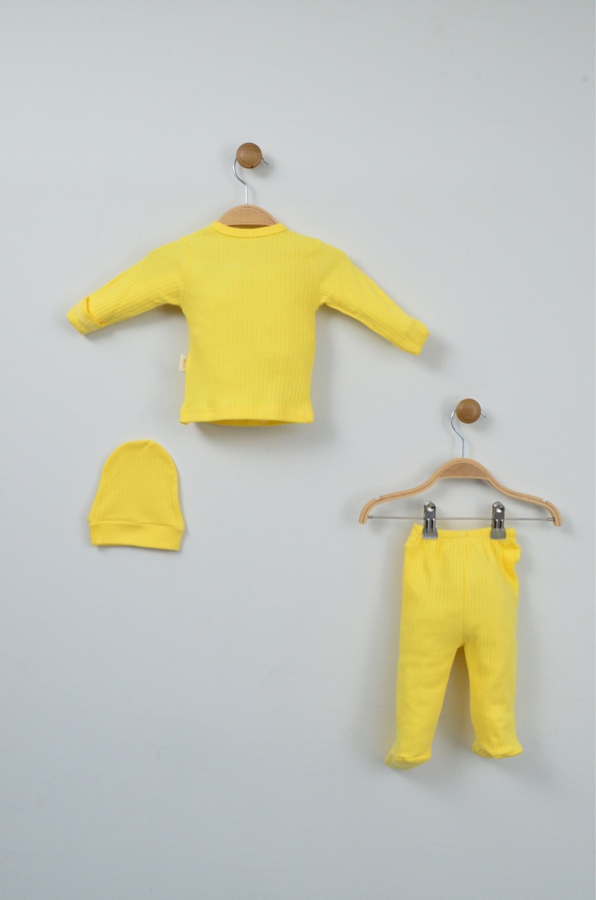 Bu sevimli sarı %100 pamuk yenidoğan üçlü takım, bebeğinizin ilk günlerinde ihtiyaç duyacağı konforu ve şirinliği bir arada sunar. Tamamen pamuk içeriği sayesinde bebeğinizin cildine nazikçe dokunur.