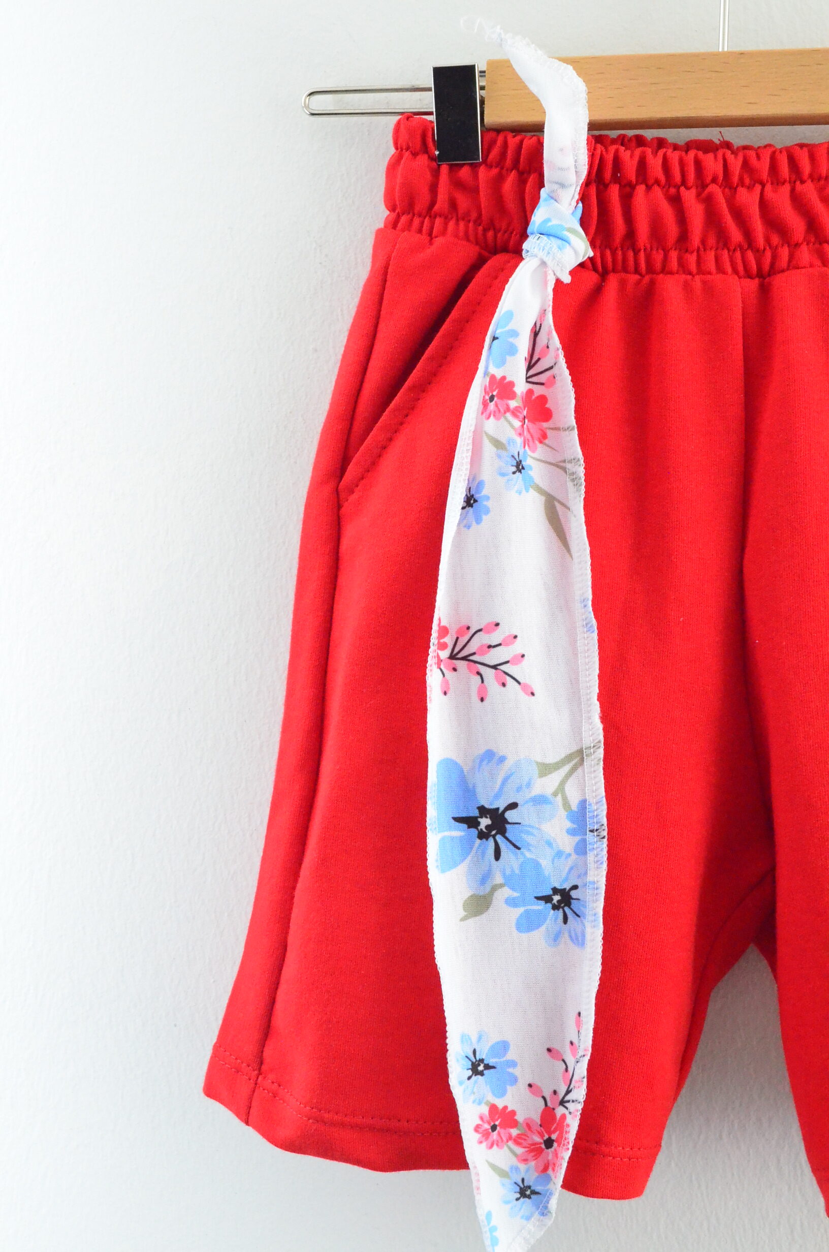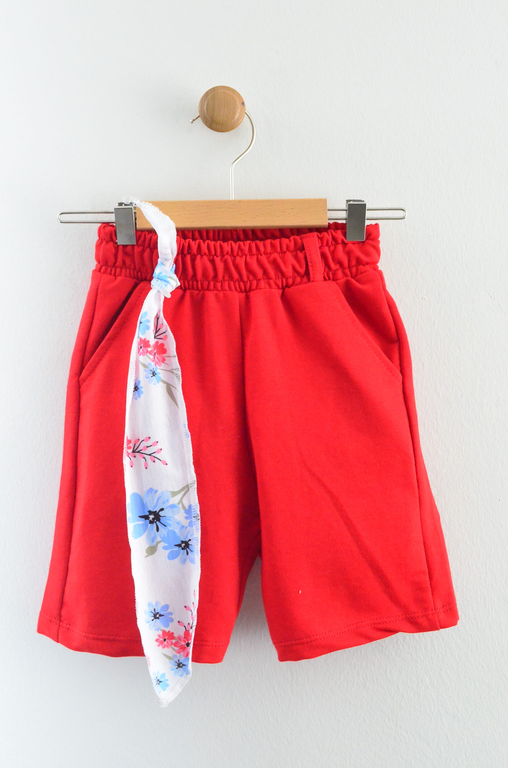 • Alt: Beli lastikli, kırmızı renkli, rahat kesim şort. Yanında çiçek desenli fular detayı bulunur.
