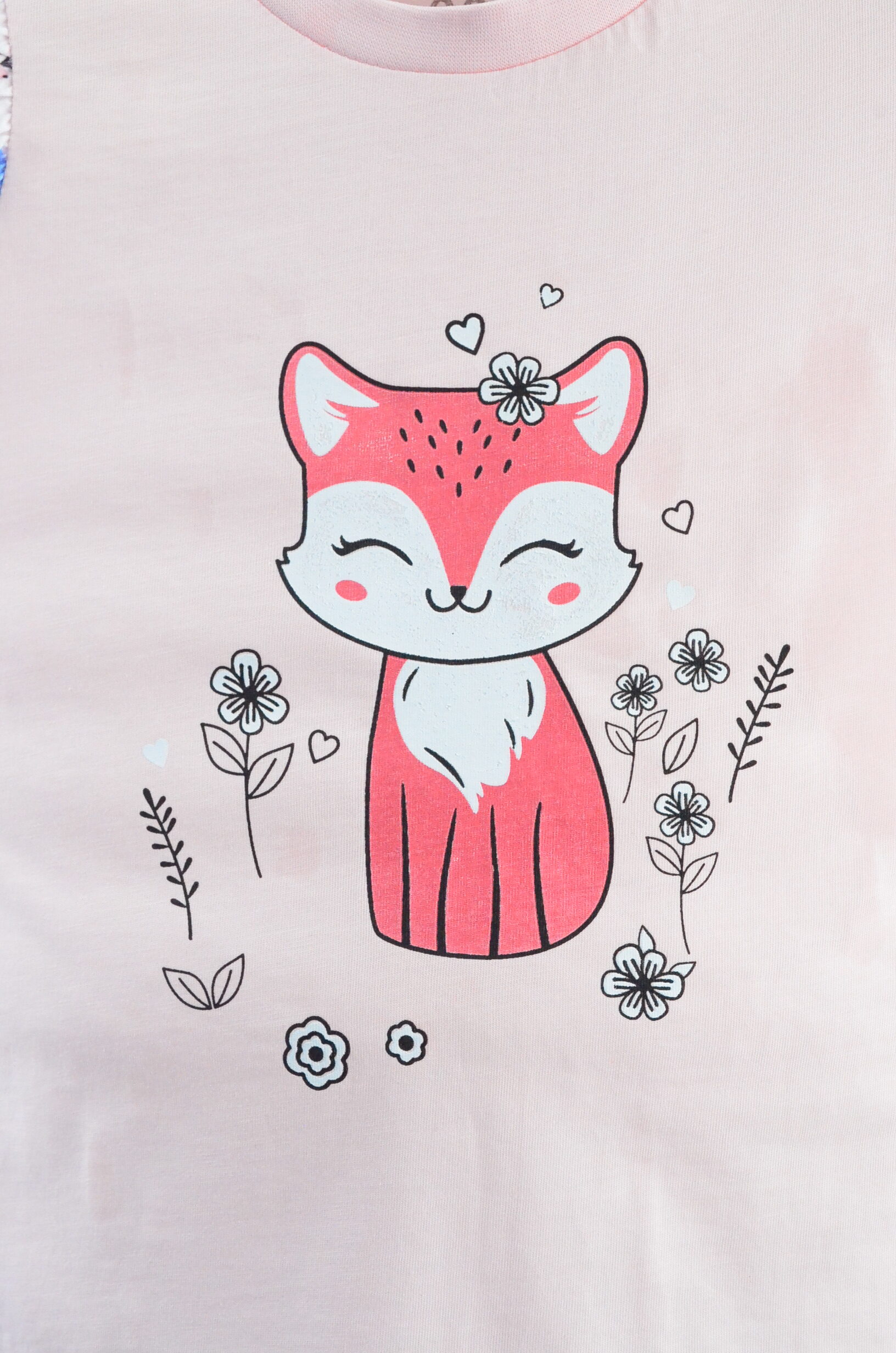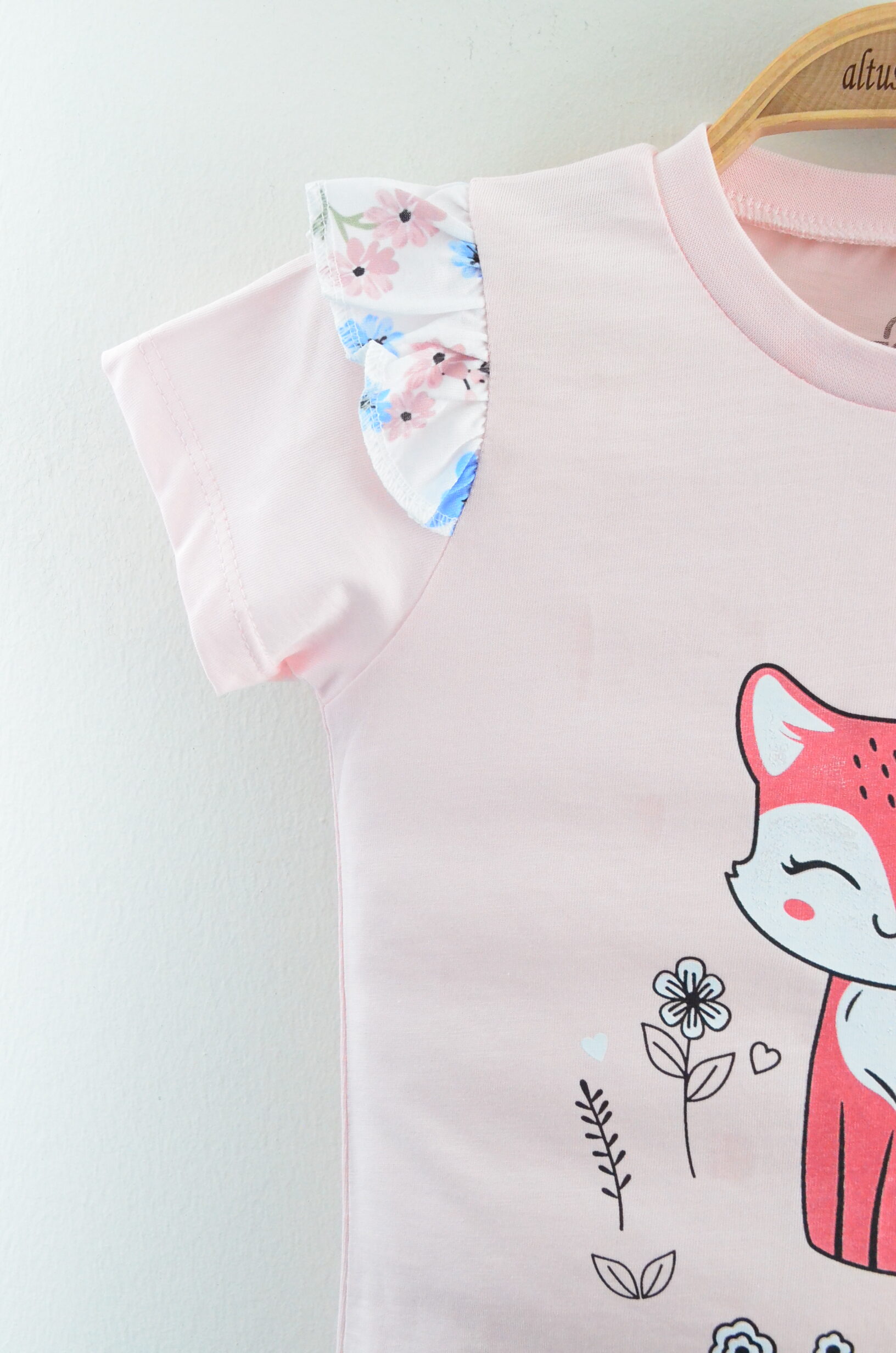 • Üst: Kısa kollu, bisiklet yaka, pembe renkli, ön kısmında sevimli tilki baskısı ve omuzlarda çiçek desenli fırfır detayı bulunur.