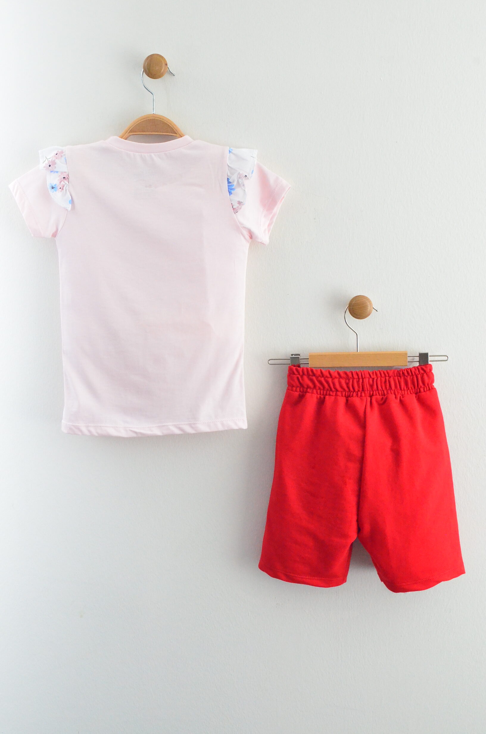 Bu iki parçalı takım, miniklerin yaz günlerine eğlence ve stil katmak için tasarlandı. Pembe tişörtün üzerindeki sevimli tilki baskısı ve omuzlarındaki fırfır detayları, uyumlu kırmızı şortla birleşerek enerjik ve canlı bir görünüm sunar. Yanındaki çiçek desenli fular detayı ise takıma hareketli bir şıklık katar.