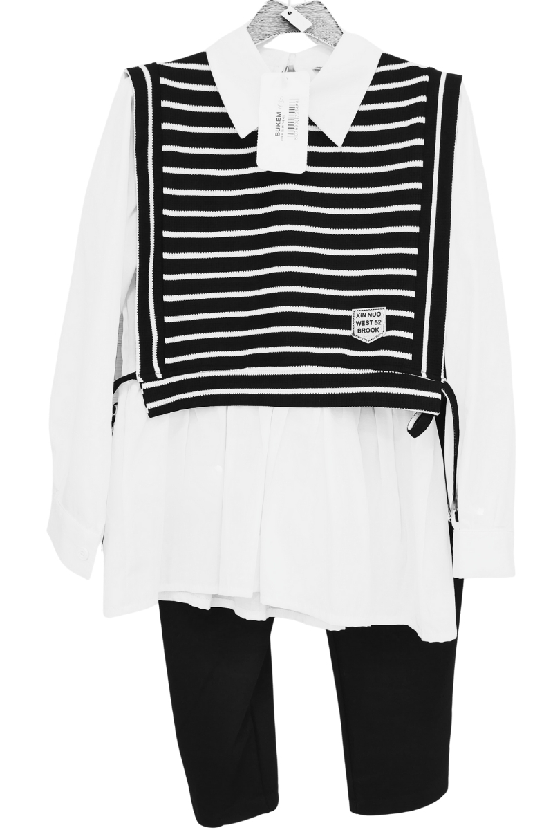 Bu zarif ve modern takım, çocuklarınızın hem günlük yaşamında hem de özel günlerde şıklığını konuşturacak. Beyaz uzun kollu gömlek üzerine giyilmiş siyah-beyaz çizgili crop üst ile tamamlanan bu kombin, altına siyah bol pantolon ve beyaz spor ayakkabılar ile mükemmel bir uyum sağlar.