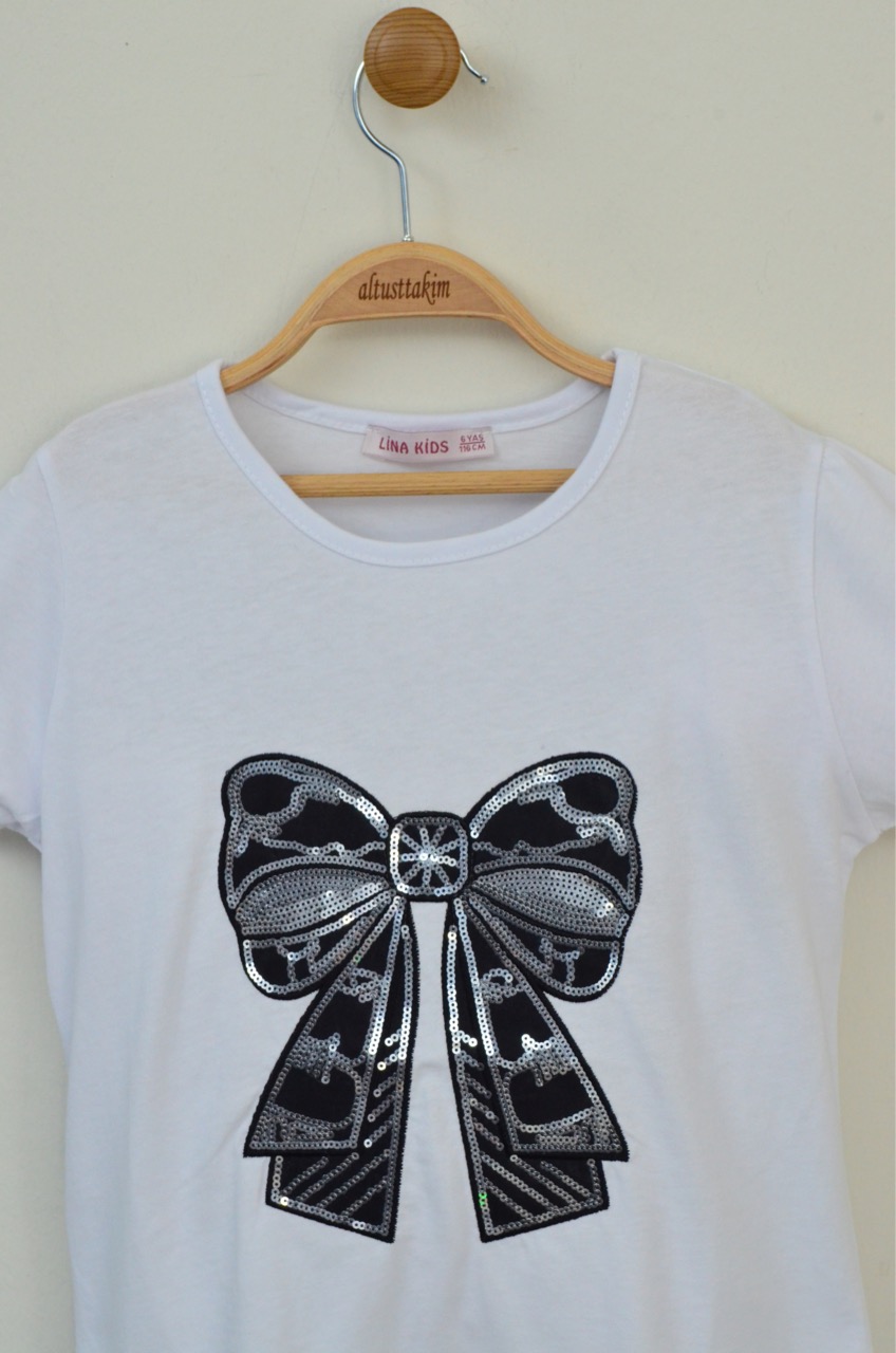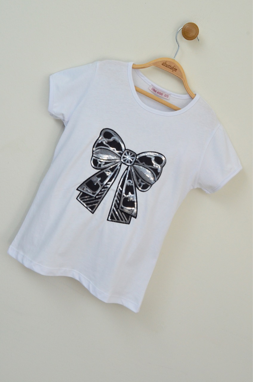 Beyaz Pullu Fiyonk Baskılı Kız Çocuk Tişört (6-15 Yaş)