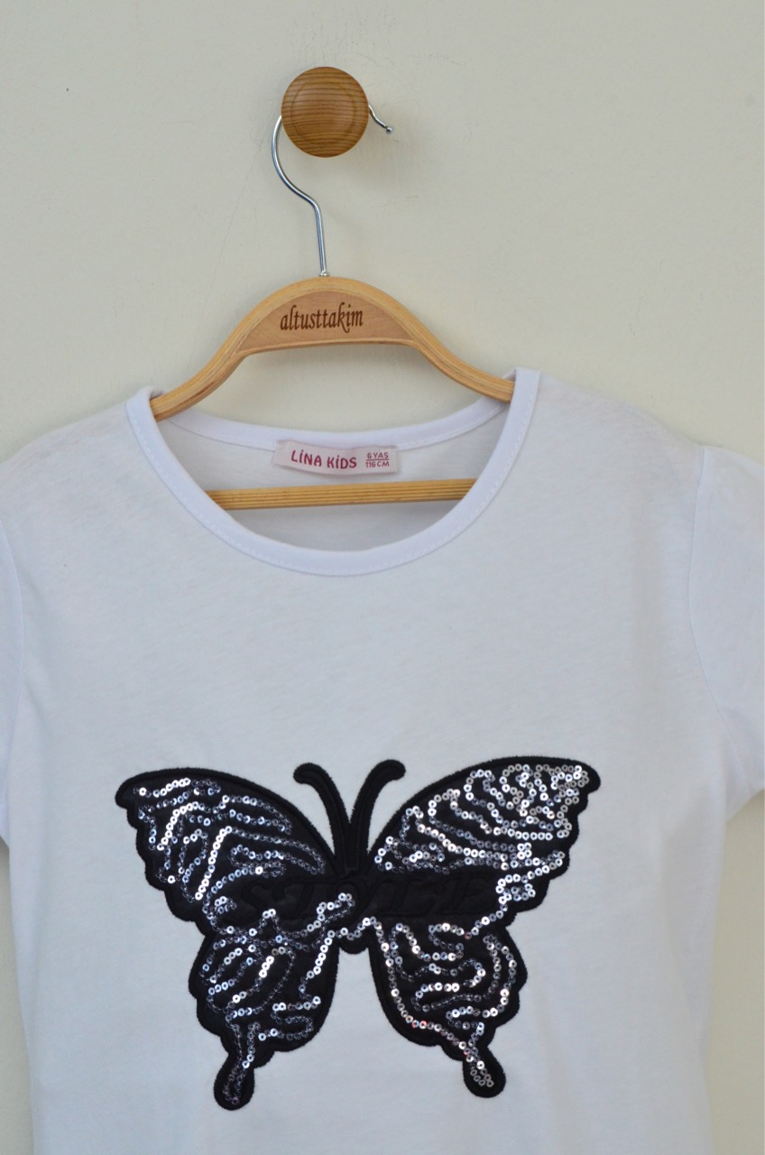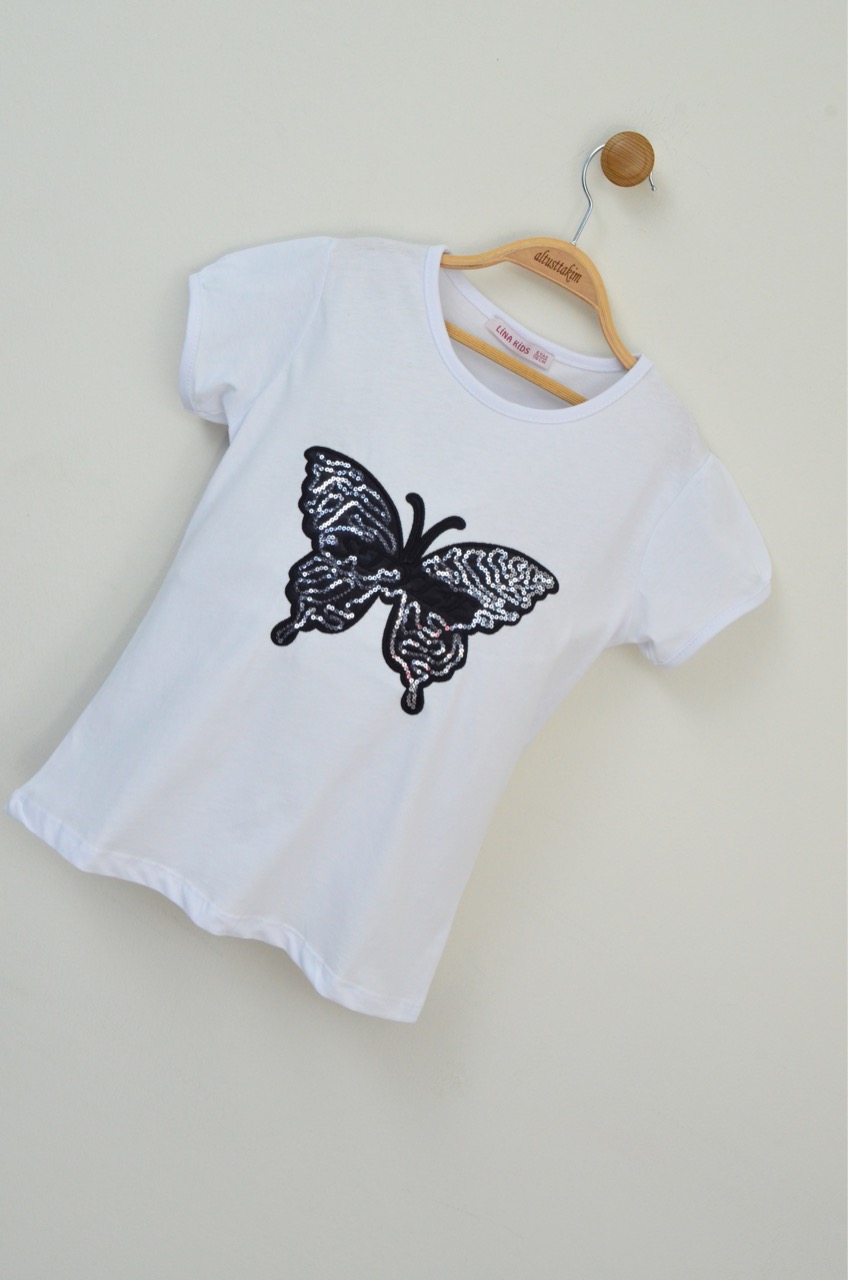 Beyaz Pullu Kelebek Baskılı Kız Çocuk Tişört (6-15 Yaş)