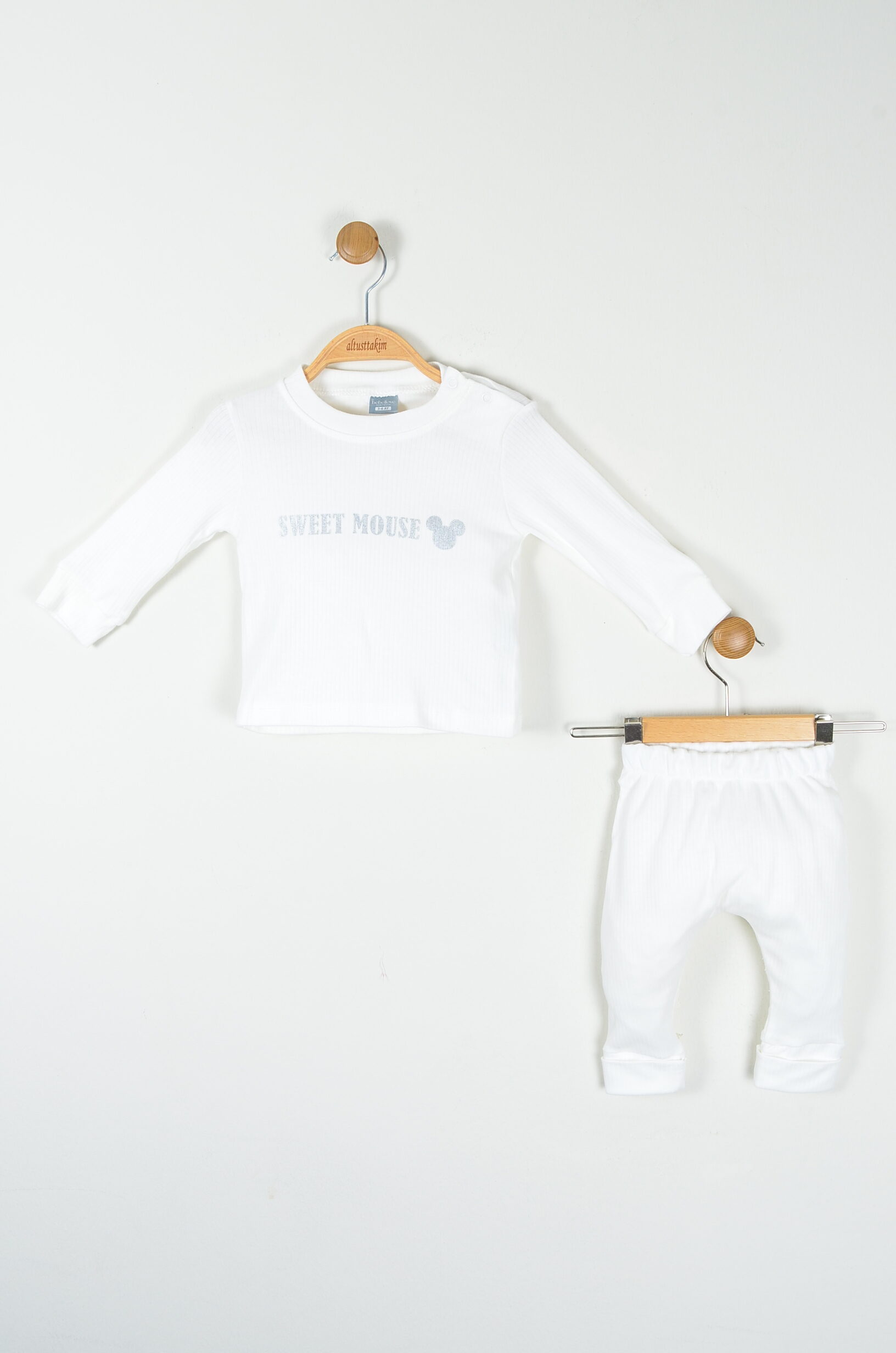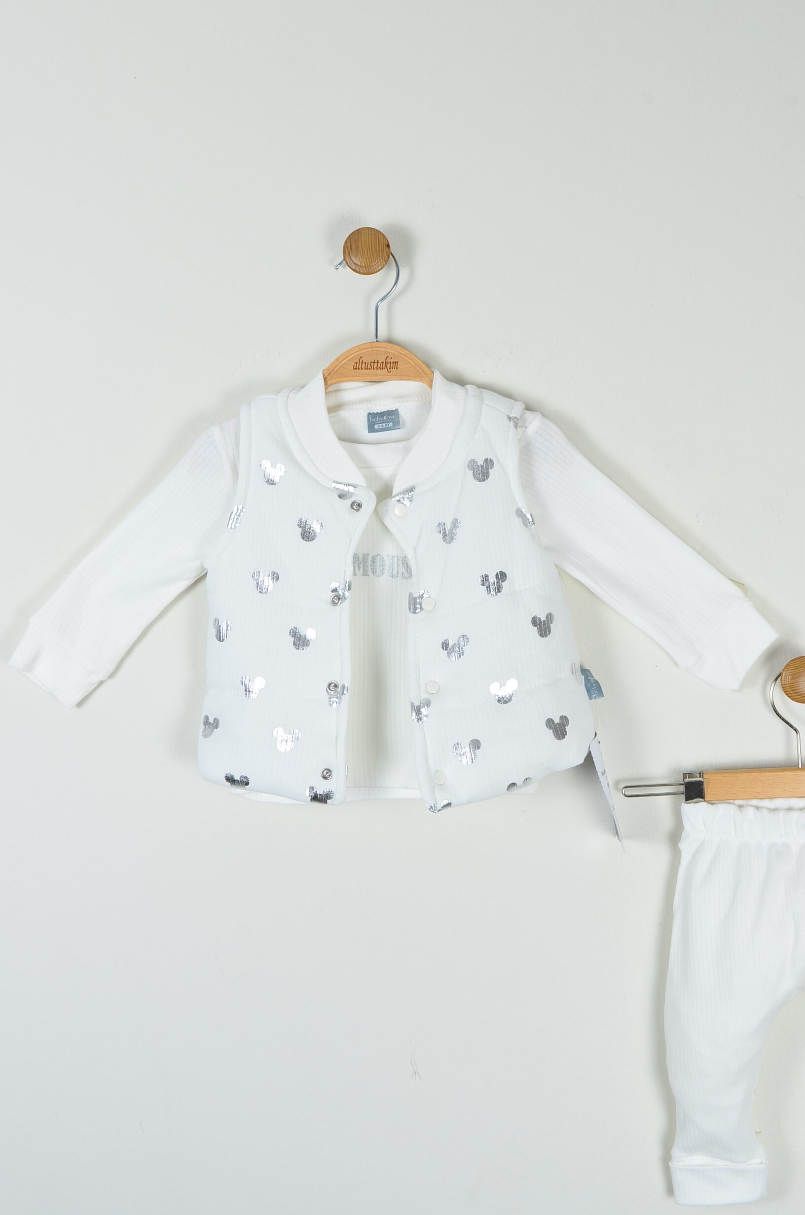 Sweet Mouse 3’lü Beyaz Bebek Takımı – Ribana Konforu, Simli Şıklık
