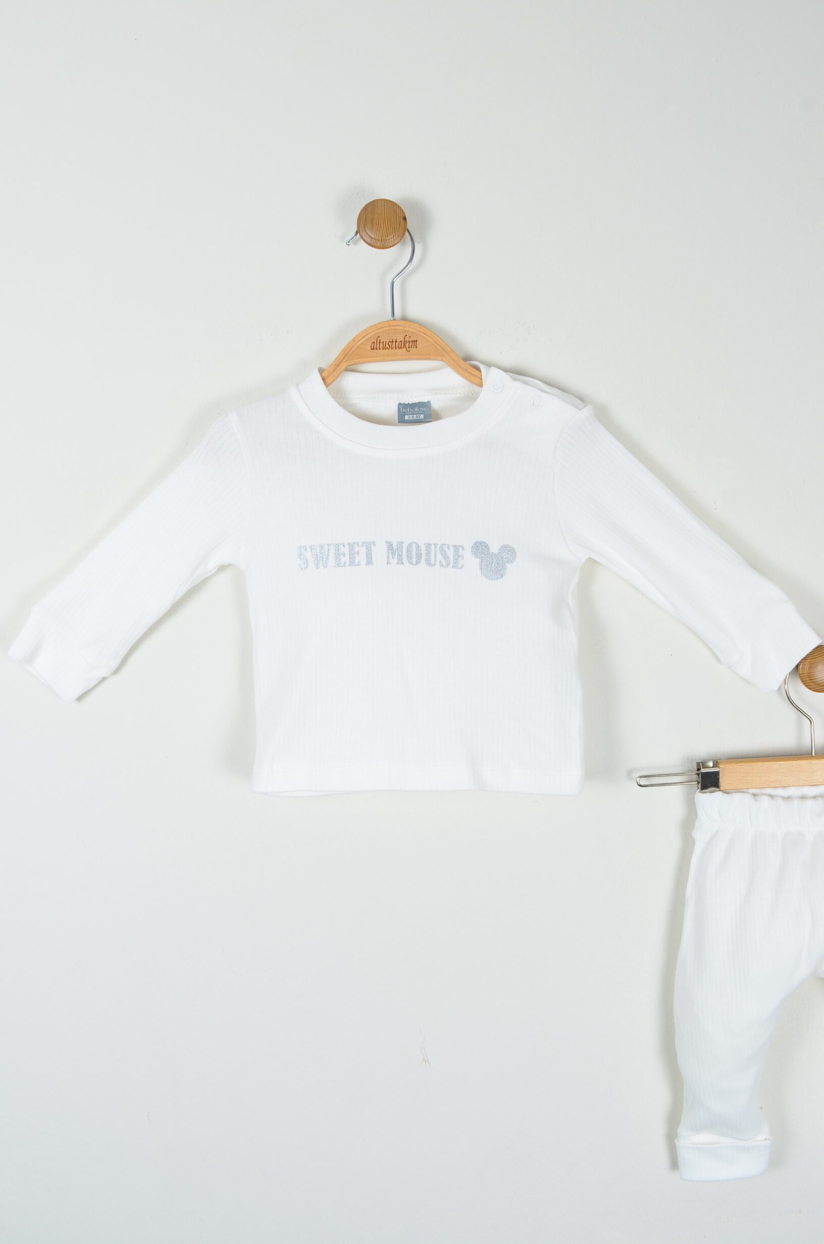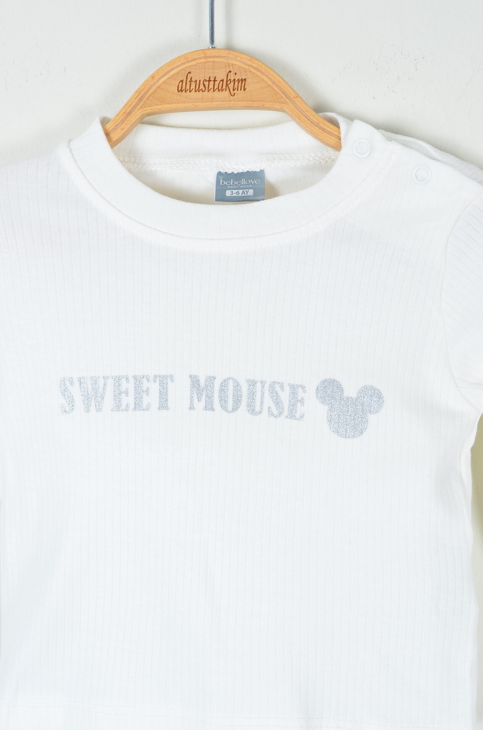 Uzun Kollu Üst: Beyaz ribana, bisiklet yaka, omuzda 2 adet çıtçıt, göğüste “SWEET MOUSE” yazısı ve gümüş sim silüet detayı.