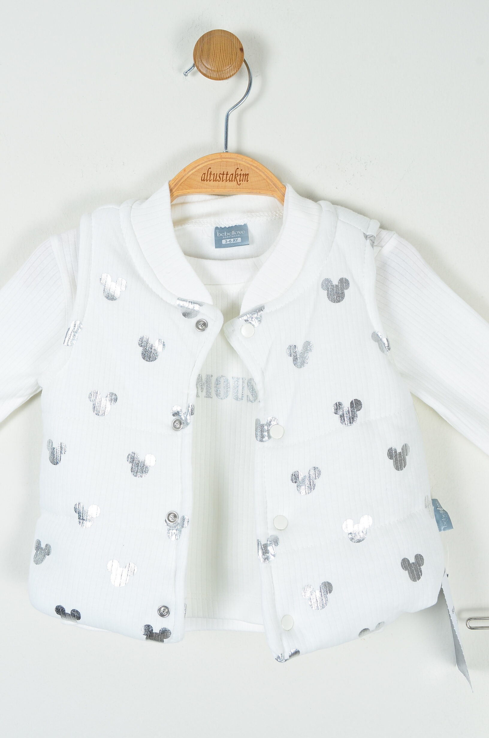 Yelek: Beyaz, hafif dolgulu, önden çıtçıtlı; tüm yüzeyde gümüş metalik küçük mouse motifleri.