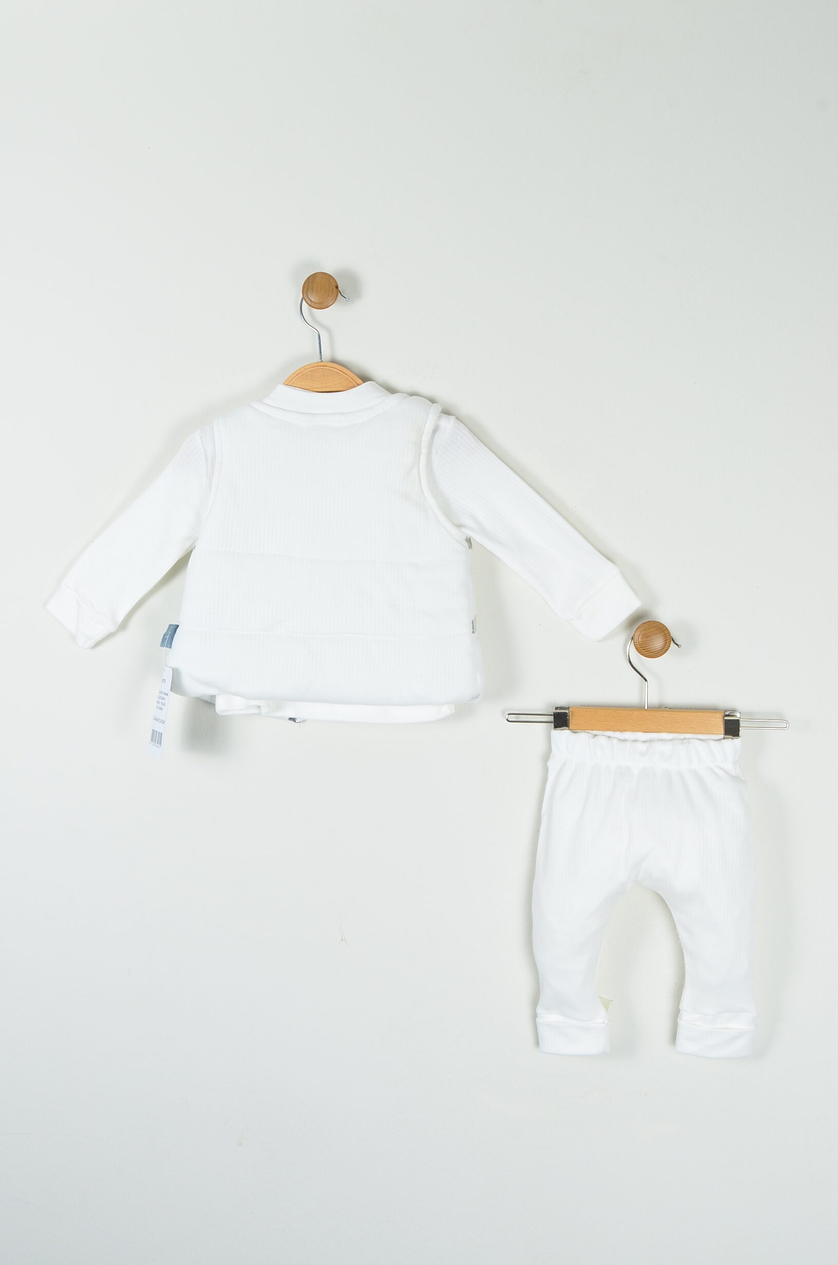 Yeni doğandan minik aylara kadar günlük kullanıma uygun bu 3’lü takım; yumuşak beyaz ribana uzun kollu üst, esnek bel bantlı alt ve gümüş sim detaylı hafif dolgulu yelekle hem konforu hem zarafeti bir araya getirir. Omuzdaki çıtçıtlar ve önden çıtçıtlı yelek sayesinde giydirip çıkarmak çok pratiktir.