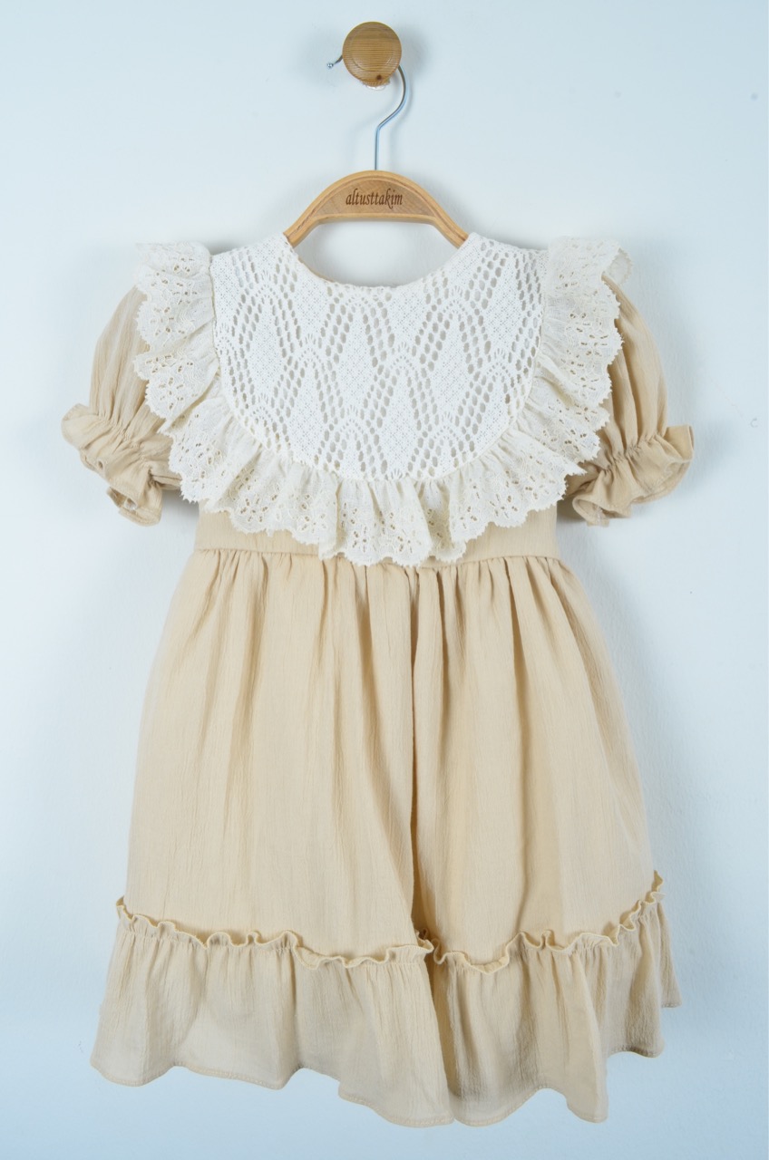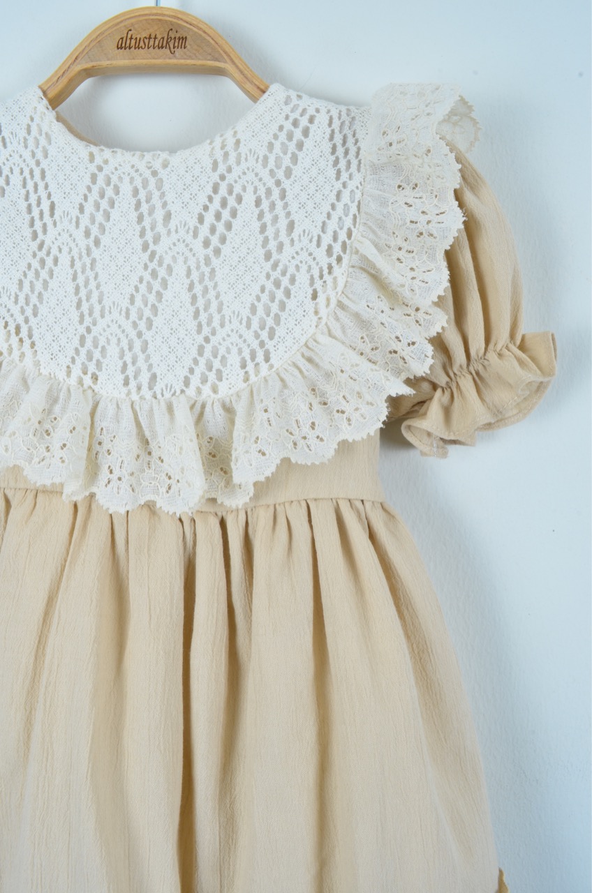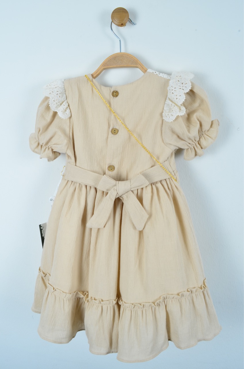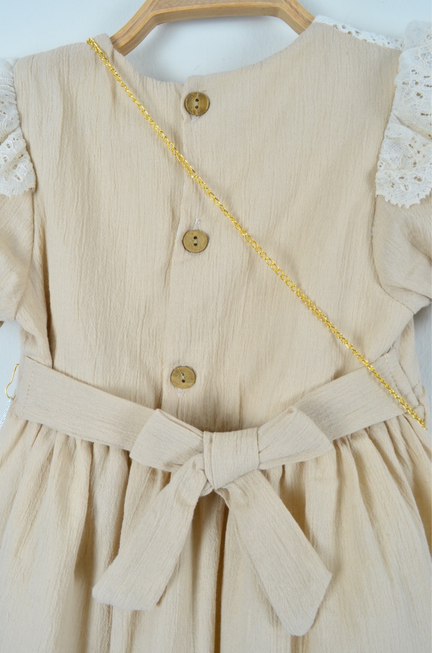 Zarif Dantel Yakalı ve Çantalı Keten Dokulu Kız Çocuk Elbisesi (2-5 Yaş)