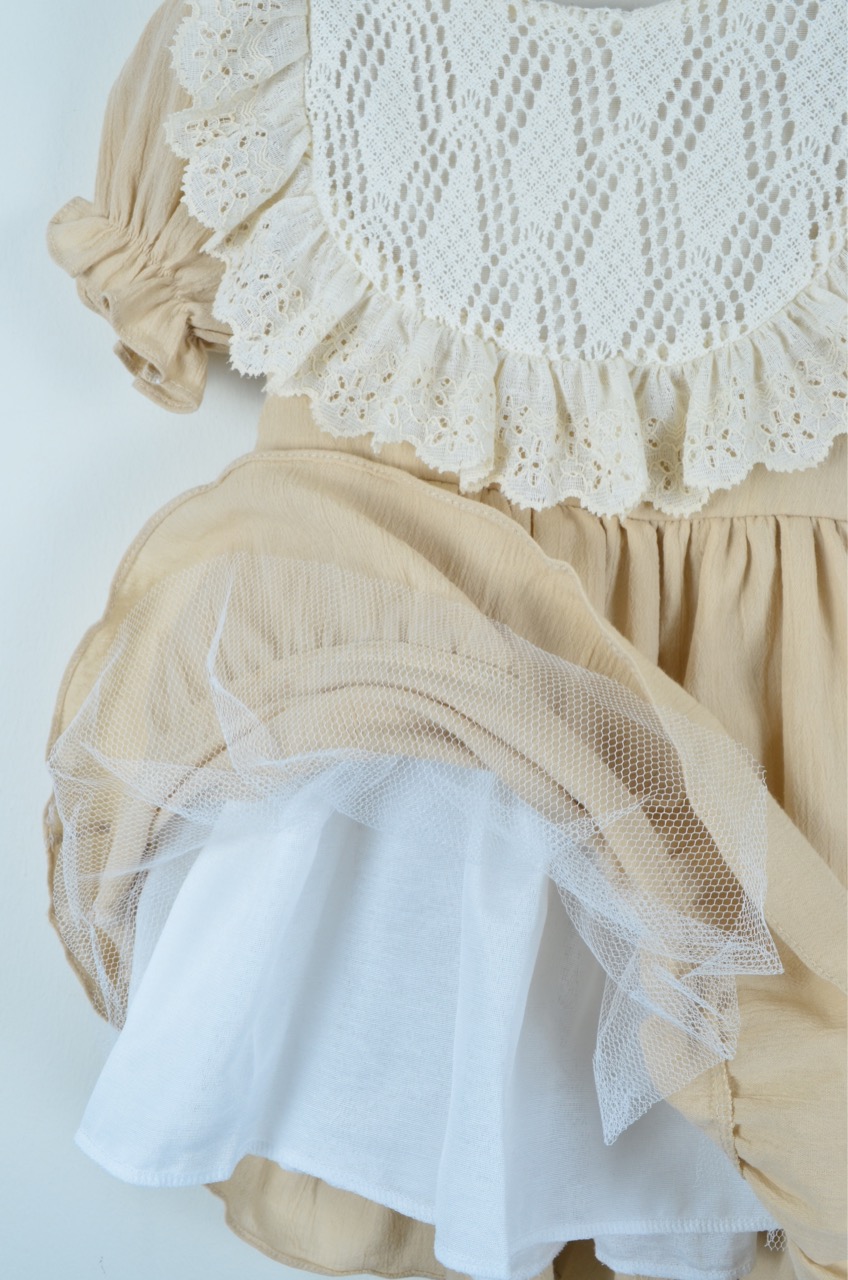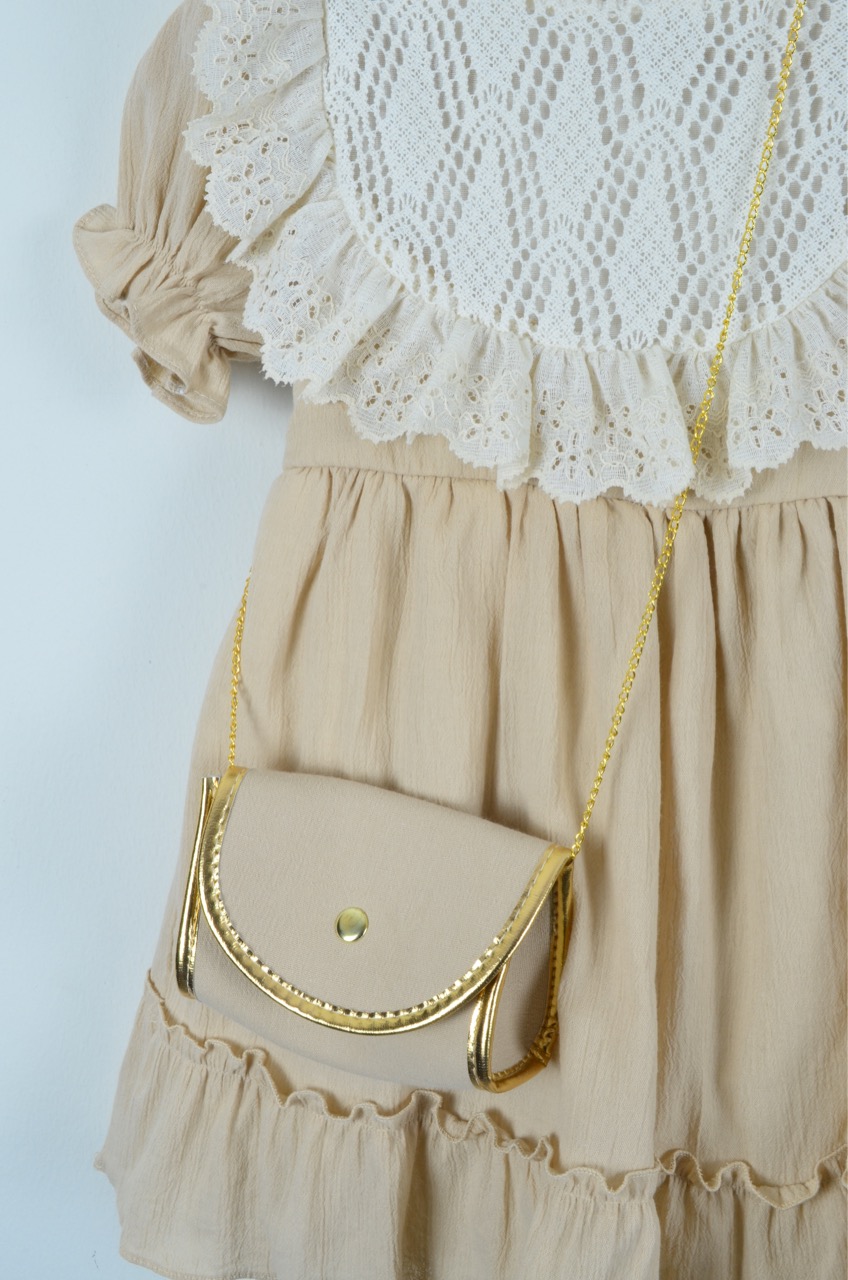 Bu özel tasarım kız çocuk elbisesi, 2 ila 5 yaş arasındaki miniklerin hem özel günlerinde hem de günlük kombinlerinde zarafeti ve rahatlığı bir araya getiriyor. Yumuşak keten dokulu dış kumaşı ve tam pamuk astarı sayesinde, çocuğunuzun hassas cildine dost bir yapı sunar ve gün boyu nefes alabilen konfor sağlar. Elbisenin dantel yakası ve ona eşlik eden sevimli çantası, kombini tamamlayan zarif detaylardır.